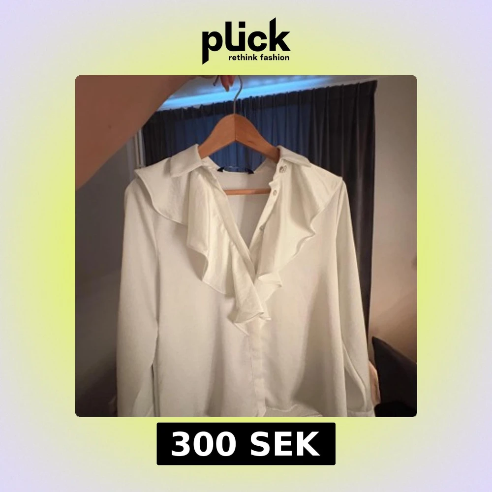 Snygg vit blus med stor volangkrage och knappar framtill. Långärmad modell med klassisk krage och dekorativa detaljer vid ärmsluten. Använt 2 gånger så den är i ny skick
