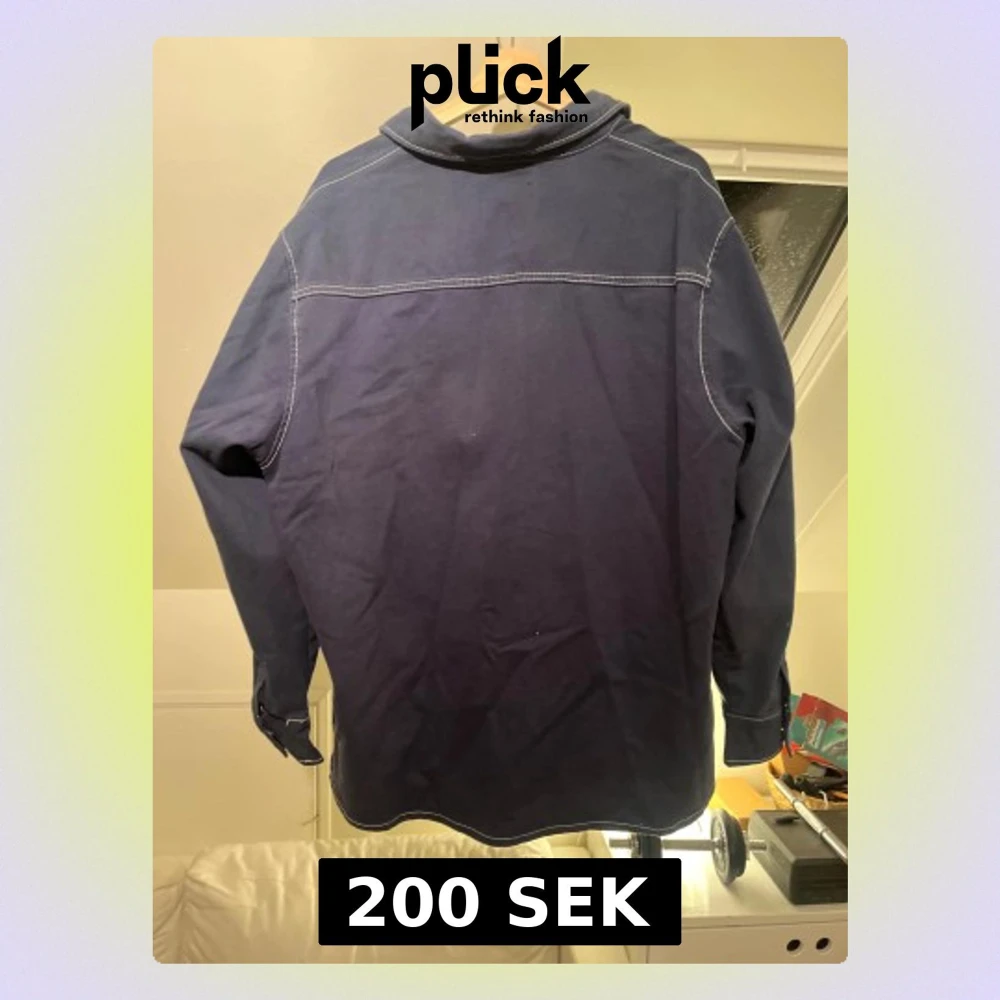 Snygg mörkblå overshirt från Zara i storlek XL. Skjortan har kontrasterande vita sömmar, klassisk krage, bröstficka och knappar framtill. Materialet är mjuk bomull som känns chill och bekvämt. Perfekt att slänga på över en t-shirt för en laidback look.