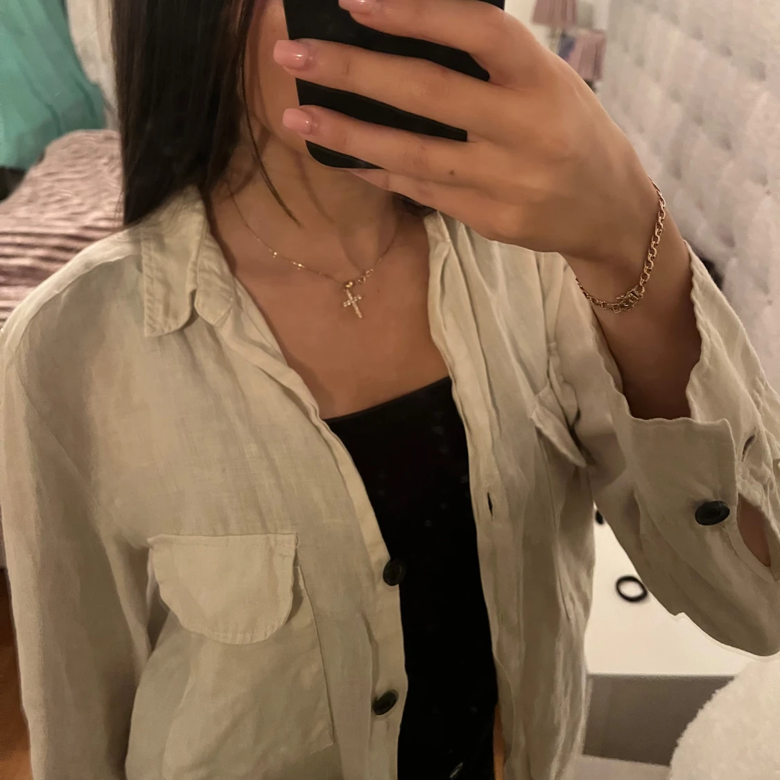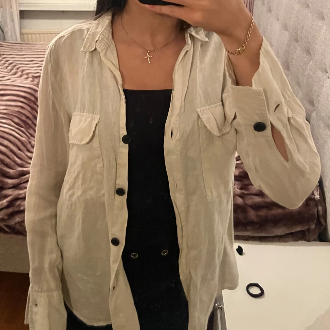 Snygg beige skjorta med svarta knappar och två bröstfickor. Perfekt för en avslappnad stil. Skjortan har långa ärmar och en klassisk krage.