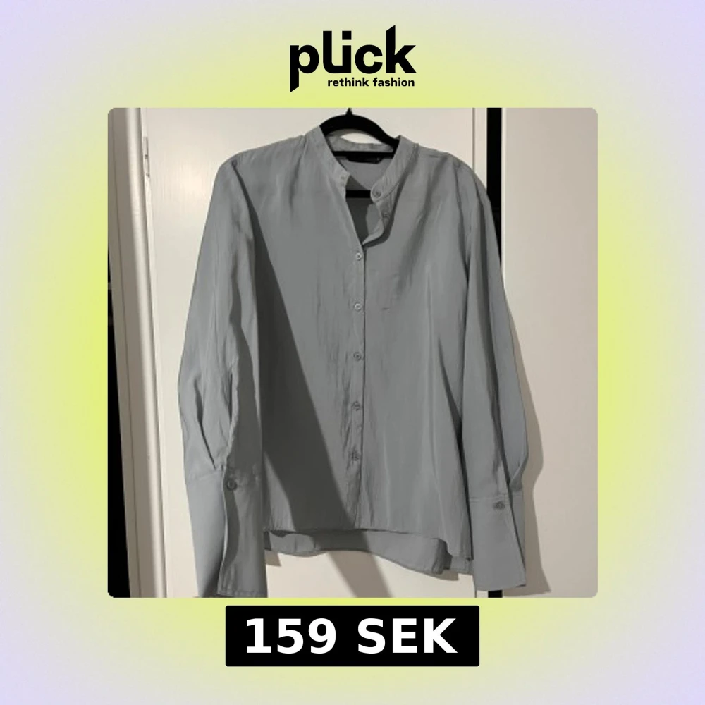 Stilig, lagom lätt och lagom oversized skjorta som funkar för formella event, kontor, till fashion-intresserade men även vardagligt. Clean och minimalistisk look. Färgen är ljusgrå med en väldigt svag blå touch. Knappar ända upp till nackden. En liten skavank på baksidan somd et syns på bilden.