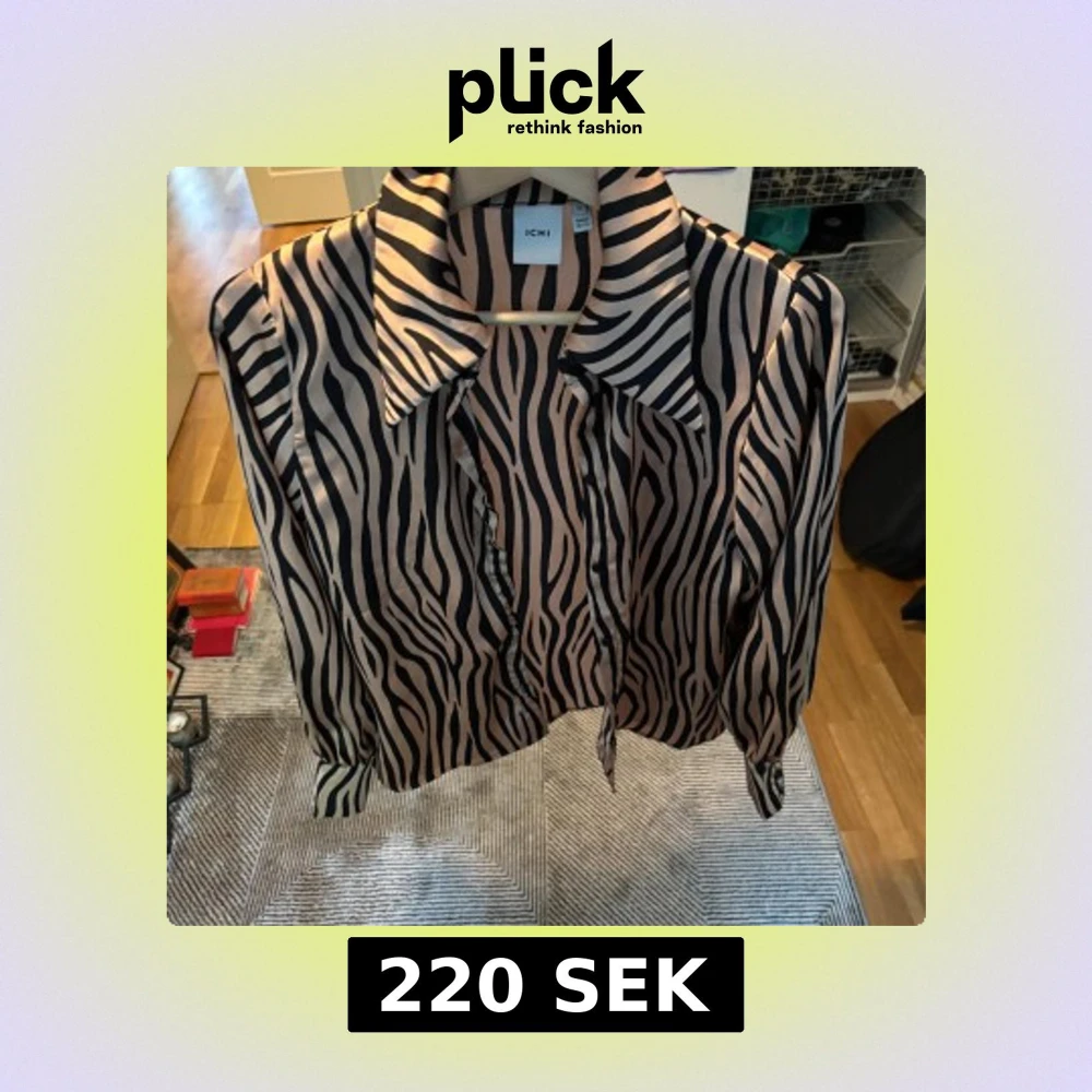 Säljer en snygg zebramönstrad blus från ICHI i beige och svart. Blusen har lång ärm, klassisk krage och knytband vid halsen. Materialet är glansigt och känns lyxigt, perfekt för att sticka ut lite extra.