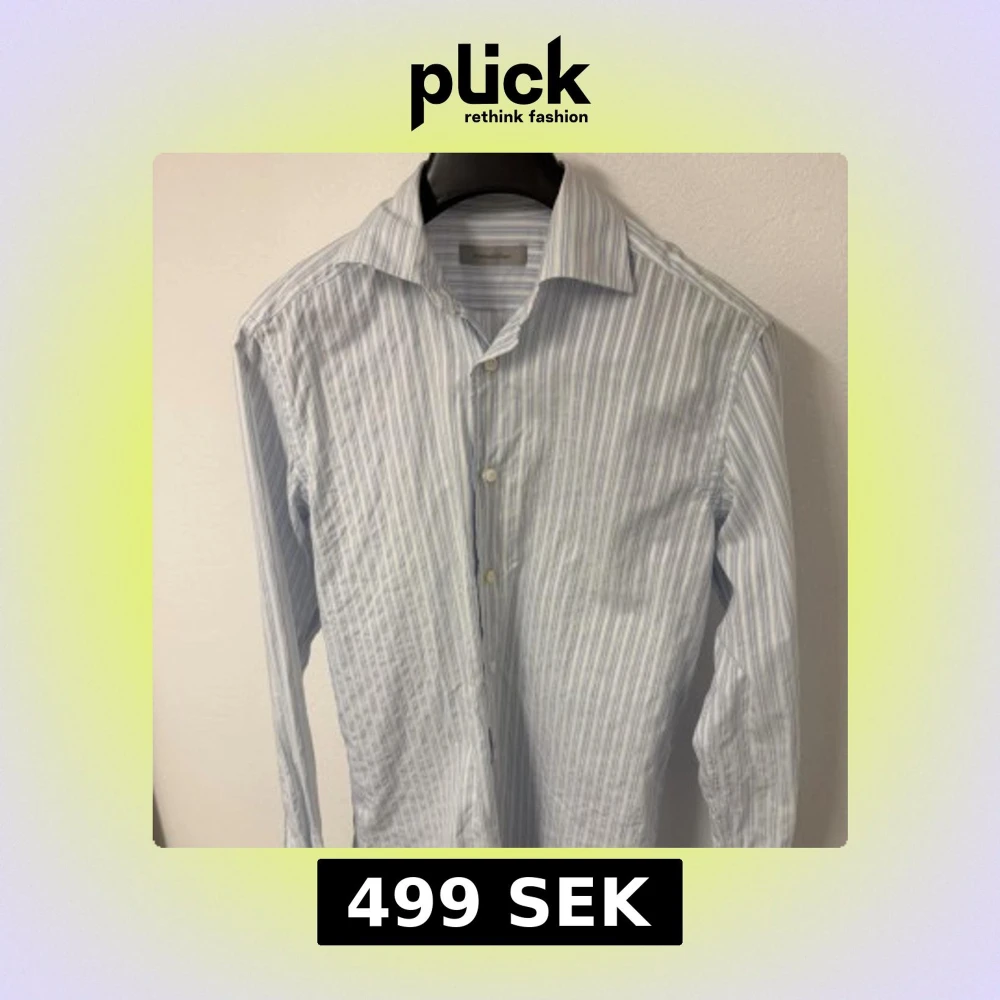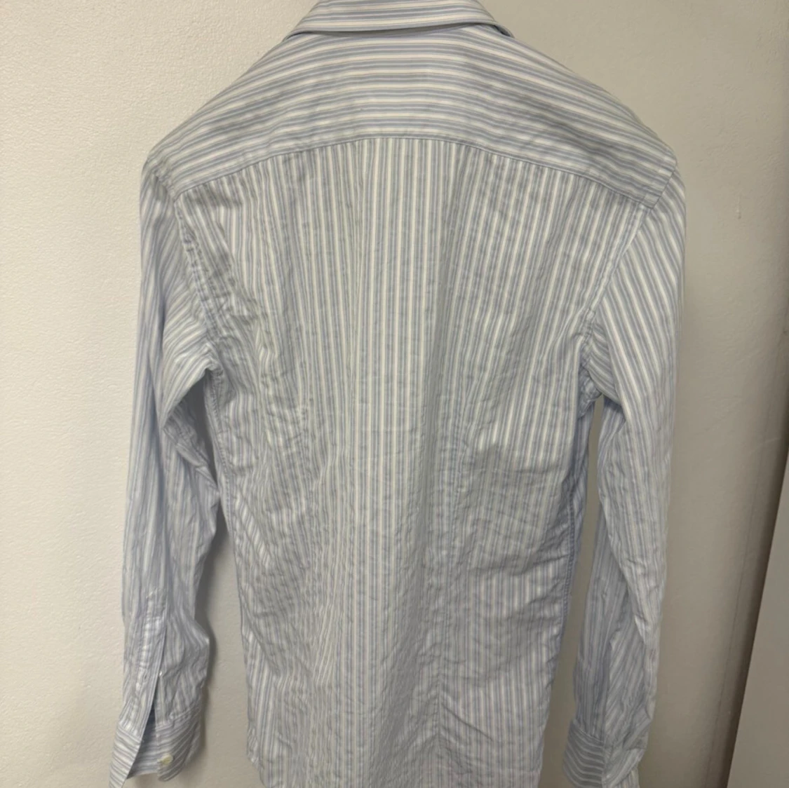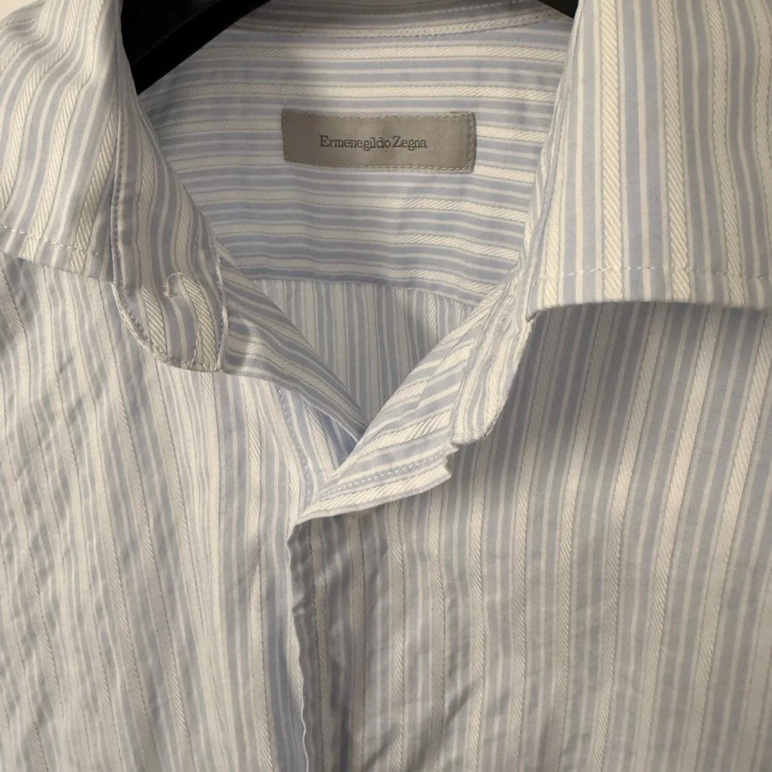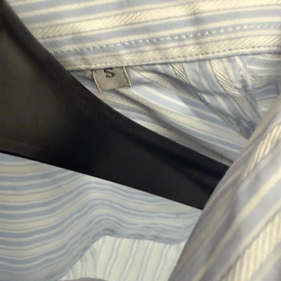 Snygg skjorta från Ermenegildo Zegna i storlek S. Den har ett klassiskt randigt mönster i ljusblått och vitt, med krage och knappar framtill. Skjortan är långärmad och tillverkad i mjuk bomull som känns skön mot huden. Perfekt för dig som gillar stilrena och fräscha plagg.