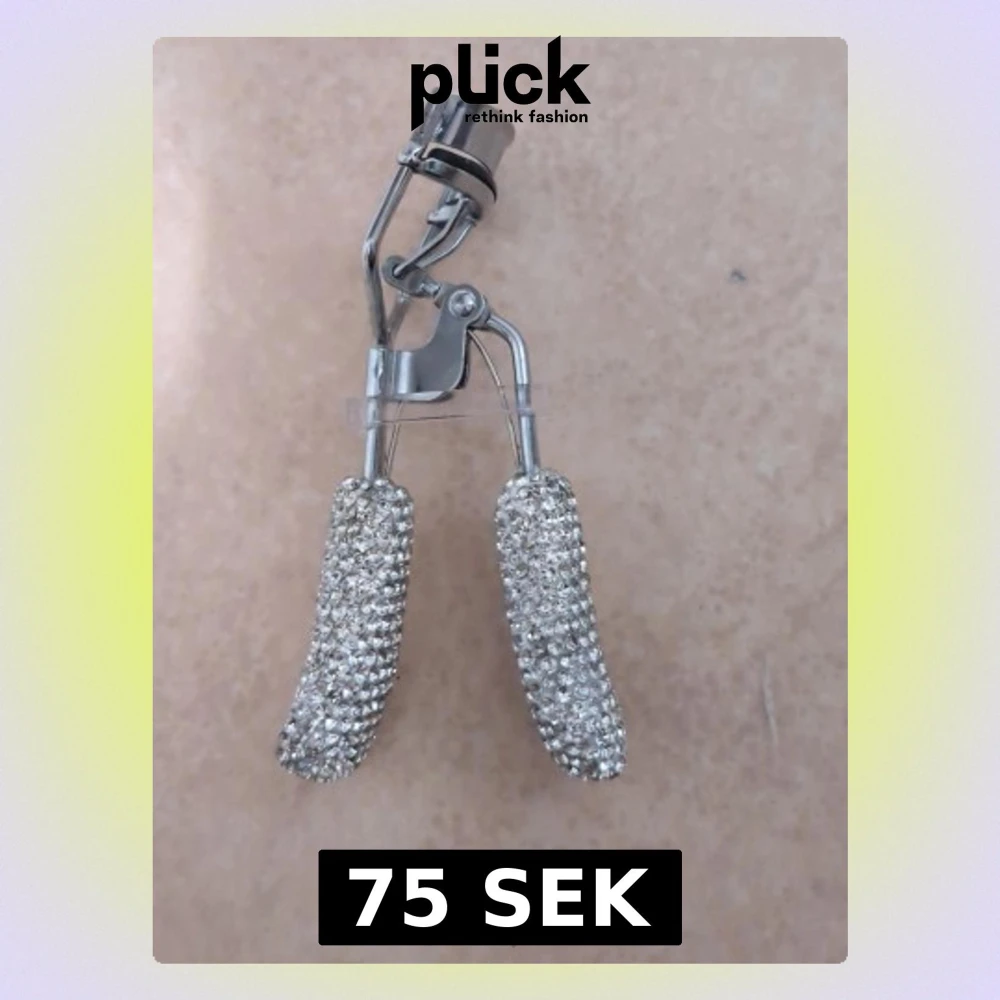 Säljer en silverfärgad ögonfransböjare med handtag täckta av glittrande strass. Metallkroppen ger stabilitet och handtagen är dekorerade med små, klara stenar för en lyxig känsla. Perfekt för att få snygg böj på fransarna och addera lite extra glam till sminkrutinen.