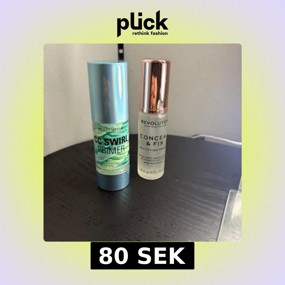 Använt 2 gånger båda Två primers från Makeup Revolution: CC Swirl Primer i blågrön swirl-design med blått lock och Conceal & Fix Mattifying Primer i frostad flaska med roséguldslock. Båda är 30 ml och perfekta för att skapa en jämn bas innan smink.