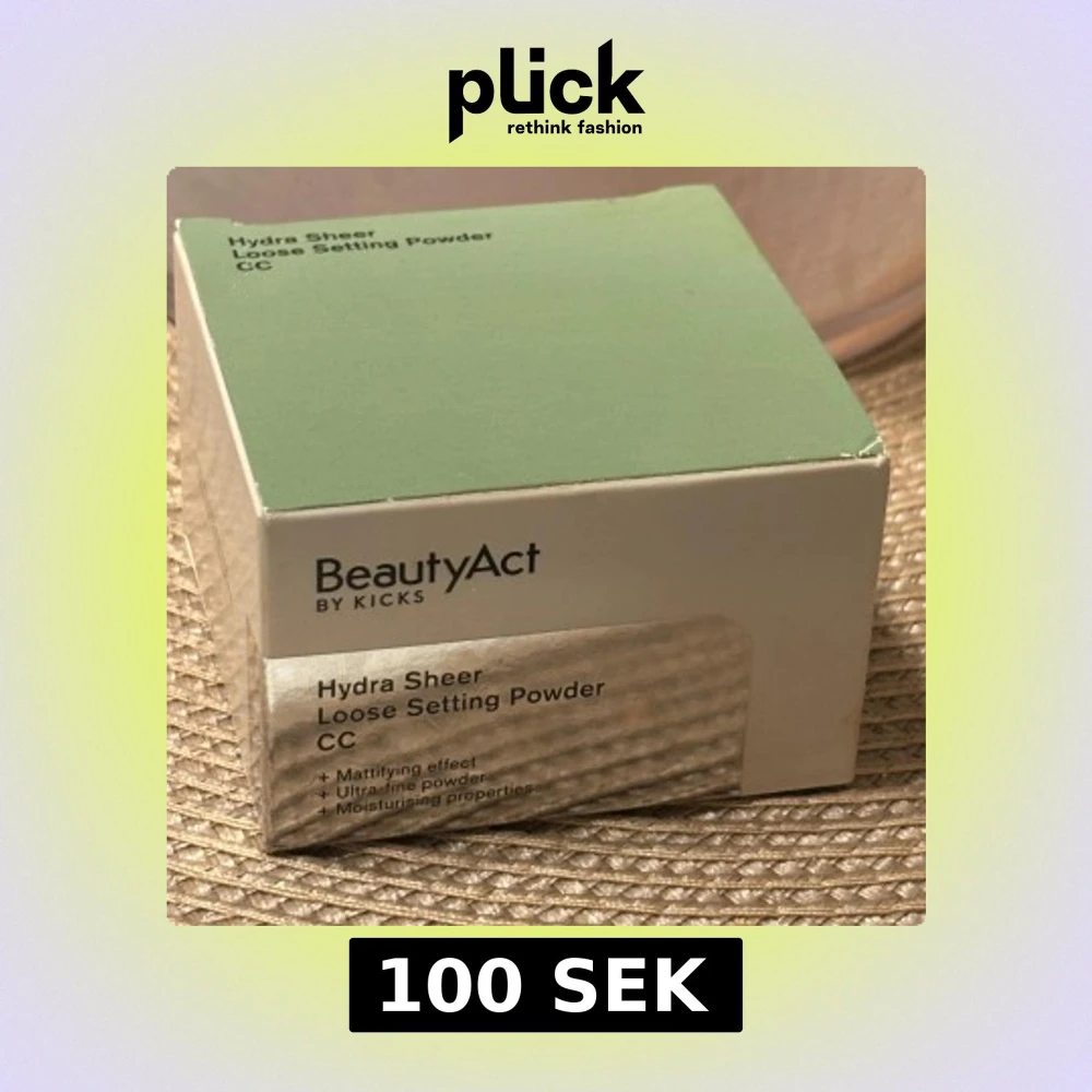 Hydra Sheer Loose Setting Powder CC från BeautyAct by Kicks. Ett ultrafint, löst puder med mattande effekt och återfuktande egenskaper. Kommer i en stilren grön och beige förpackning. Perfekt för att fixera din makeup och ge en naturlig finish.