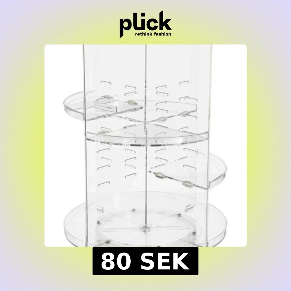 Transparent roterande sminkorganizer i akryl med flera hyllplan och fack för att förvara sminkprodukter som borstar, läppstift och ögonskuggor. Perfekt för att hålla ordning på sminkbordet och enkelt hitta dina favoriter.