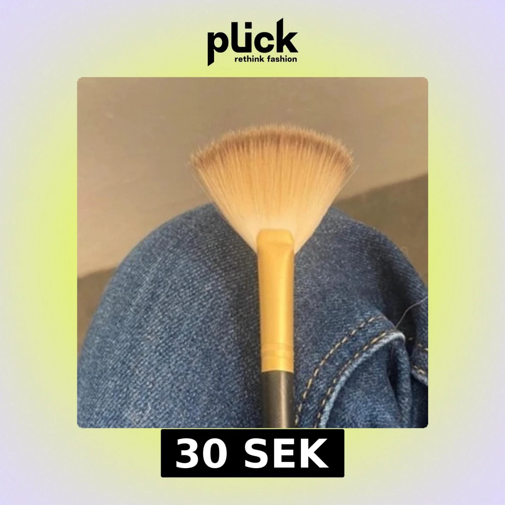 En sminkborste med solfjäderformad borst, perfekt för highlighter eller att svepa bort ögonskuggsfall. Borsten har ljust beige strån och ett gult skaft med svart handtag. Enkel att använda för en flawless finish.
