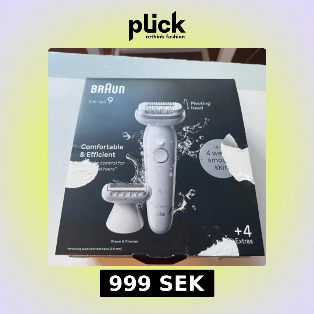 Braun Silk-épil 9 epilator i vitt med silverdetaljer, levereras med flera tillbehör som rakhuvud, trimmer och praktisk grå förvaringsväska. Laddare och manual ingår. Ergonomisk design och svängbart huvud för smidig hårborttagning.