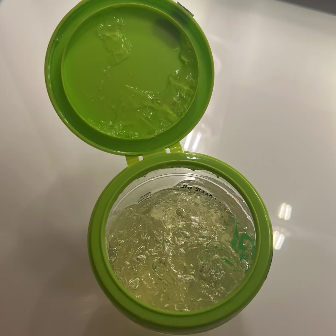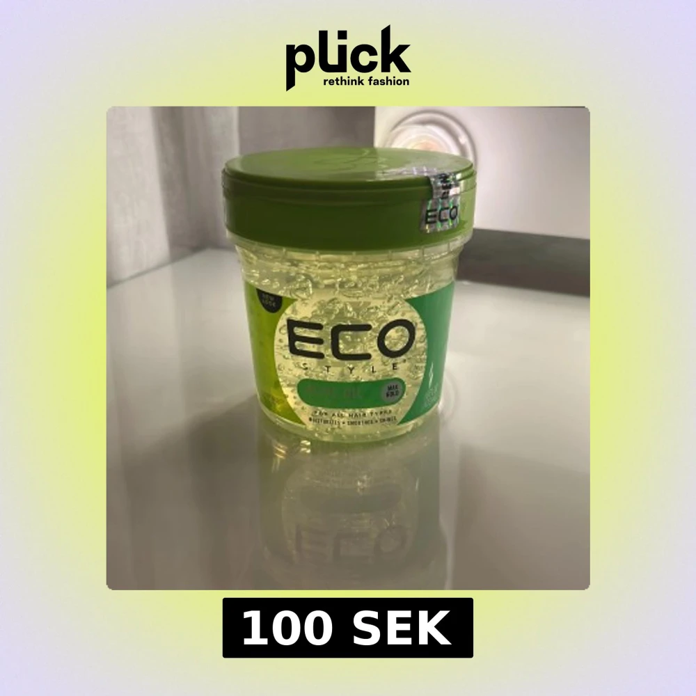 Eco Style Olive Oil hårgel i en rund plastburk med grön lock. Gelen är transparent med en svagt gul ton och har en lätt, geléaktig konsistens. Perfekt för att styla och ge glans till håret. Innehåller olivolja som återfuktar och ger maximal stadga.