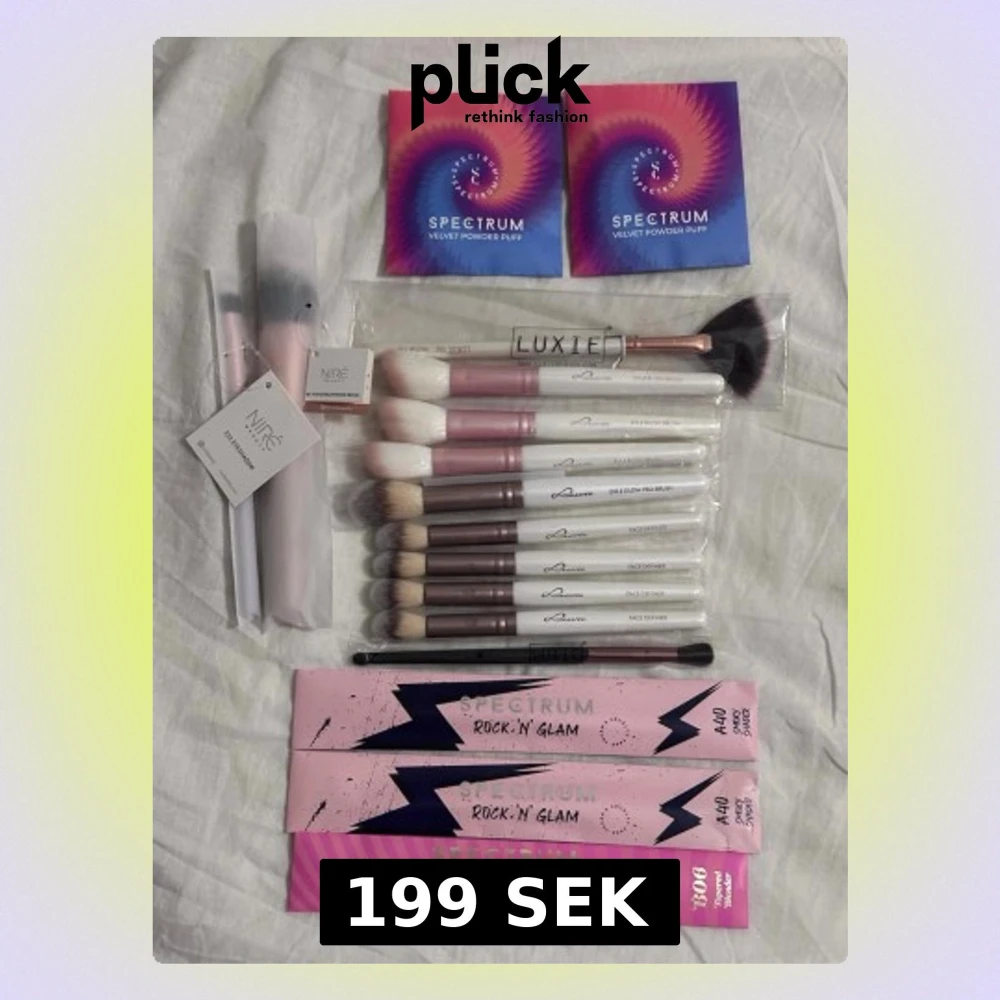 Säljer ett kit med 17 sminkborstar från Luxie och Nire i rosa och vitt, samt två Spectrum Velvet Powder Puff och tre ögonskuggsborstar i snygga förpackningar. Perfekt för dig som vill ha ett komplett set för ansikte och ögon.