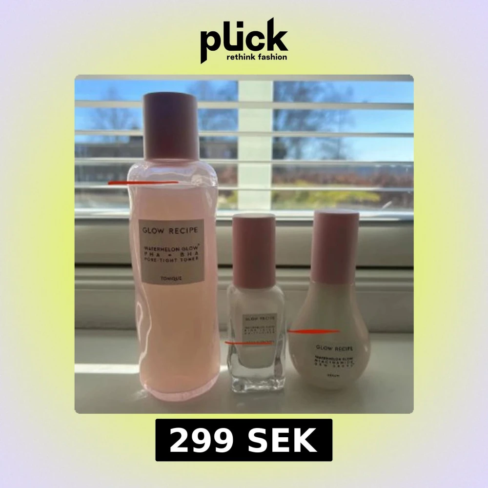Glow Recipe-set med tre produkter: toner, dew drops (40 ml), juicy moisturiser (mini). På bilderna ser man hur mycket som är kvar💕KOMMER INTE SÄNKA PRISET‼️(redan väldigt lågt)