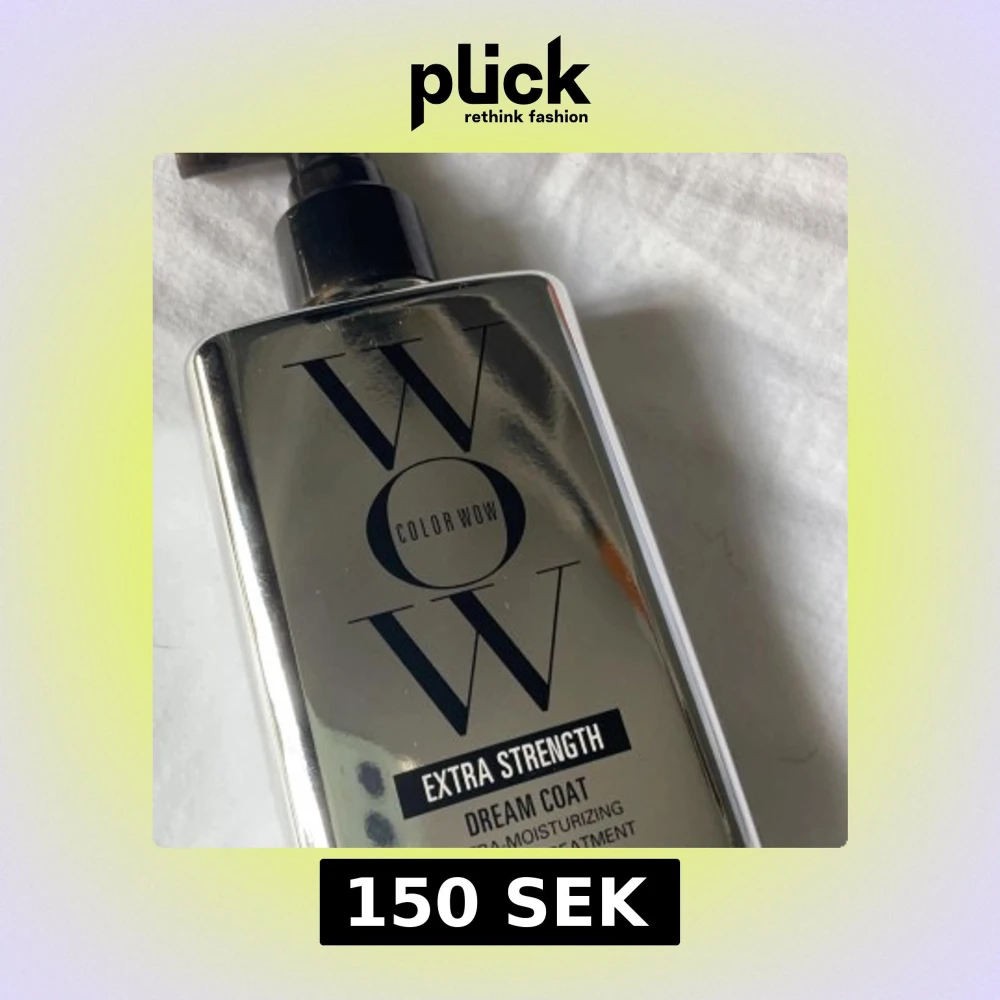 Color Wow Extra Strength Dream Coat är en fuktgivande spray i en silverfärgad pumpflaska. Produkten är framtagen för att ge extra styrka och glans till håret. Flaskan har en modern design med svart text och spegelblank yta.