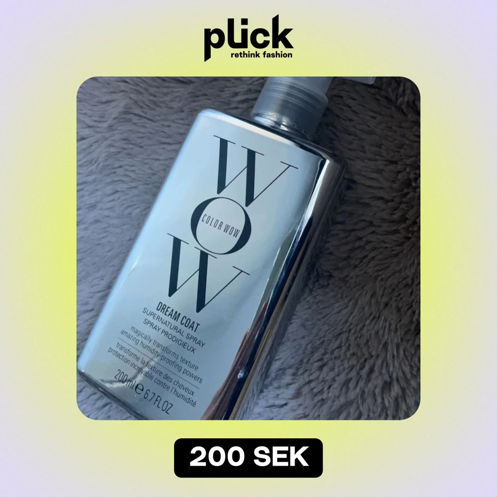 Säljer en flaska Color Wow Dream Coat Supernatural Spray, 200 ml. Denna spray är känd för att magiskt transformera hårets textur och ge en fuktresistent finish. Perfekt för att få ett slätt och glänsande resultat. Flaskan är silverfärgad med en praktisk pump för enkel applicering.