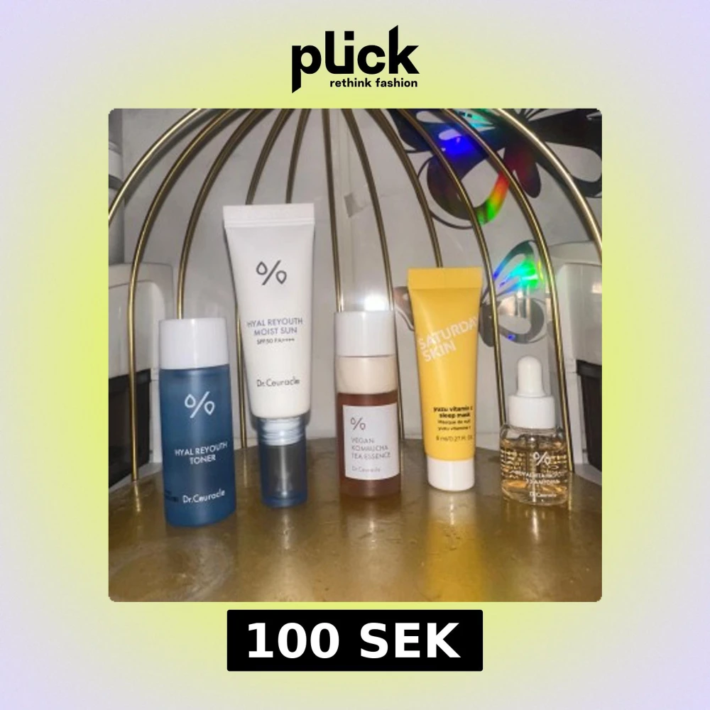 Set med Dr.Ceuracle Hyal Reyouth toner (blå flaska), Hyal Reyouth Moist Sun SPF50 (vit tub), Vegan Kombucha Tea Essence (brun flaska) och Advacita Pro Ampoule (genomskinlig flaska med pipett). Inkluderar även Saturday Skin Yuzu Vitamin C Sleep Mask i gul tub.
