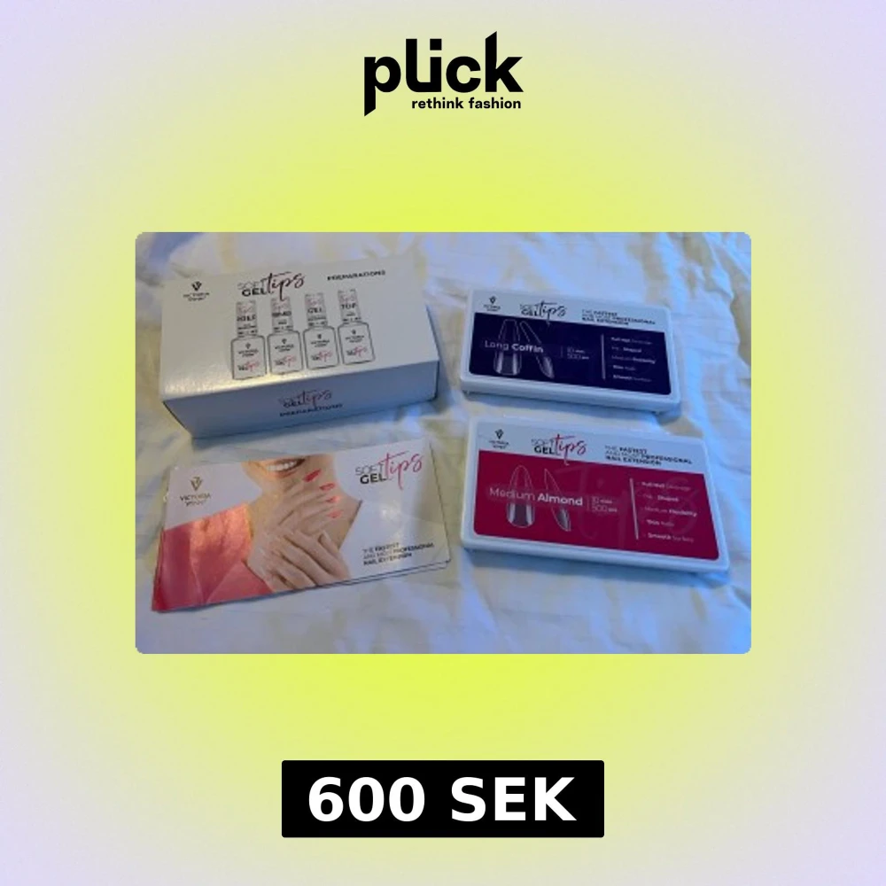 Komplett kit med Soft Gel Tips (Soak Off) från Victoria Vynn, innehåller två askar med formerna Long Coffin och Medium Almond, samt preparationskit med fil, prep, primer, gel och top. Använd till ca 2 sett på mig själv, filen ej använd. Nypris på allt 1100.