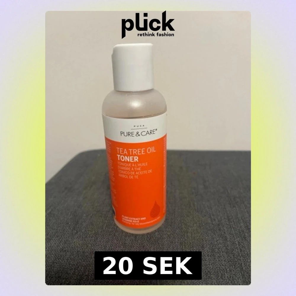 Tea Tree Oil Toner från Pure & Care i en genomskinlig plastflaska med vit kork och orange etikett. Tonern innehåller växtextrakt och vitamin B3+E, och är speciellt framtagen för att rengöra och fräscha upp huden samt förbättra hudens elasticitet. Passar perfekt för dig som vill ha en fräsch känsla efter rengöring.