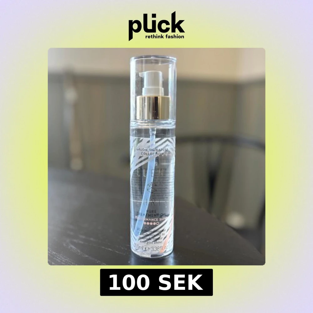 En pumpflaska med Pure Treatment Oil från Eleni & Chris. Oljan är framtagen för att ge glans och vård till håret, innehåller skandinavisk hjortronolja och har en lyxig design med guldiga detaljer. Flaskan rymmer 100 ml. Använd till den övre texten på flaskan. Nypris är 379 kr 🤍