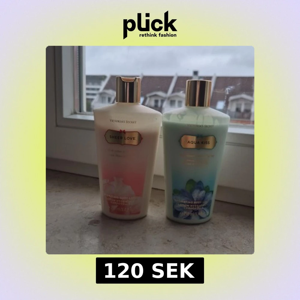 Två body lotions från Victoria's Secret: 'Sheer Love' i en ljusrosa flaska och 'Aqua Kiss' i en ljusblå flaska. Båda har guldiga lock och är designade för att återfukta huden med en lätt doft.