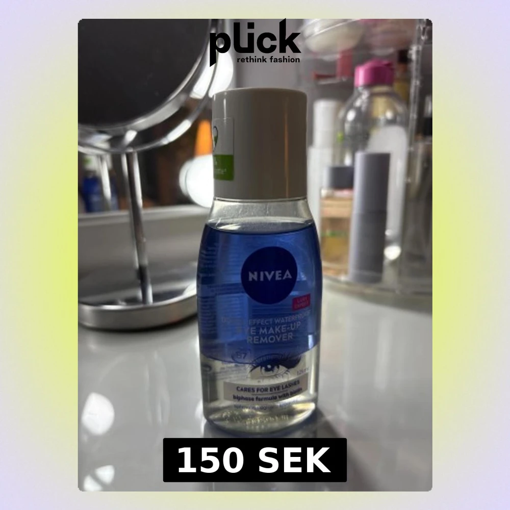 NIVEA Double Effect Waterproof Eye Make-Up Remover, 125 ml. Tvåfasig formula med biotin som tar bort vattenfast smink och vårdar fransarna. Blå och genomskinlig vätska i plastflaska med vit kork. Perfekt för att ta bort ögonmakeup snabbt och skonsamt.