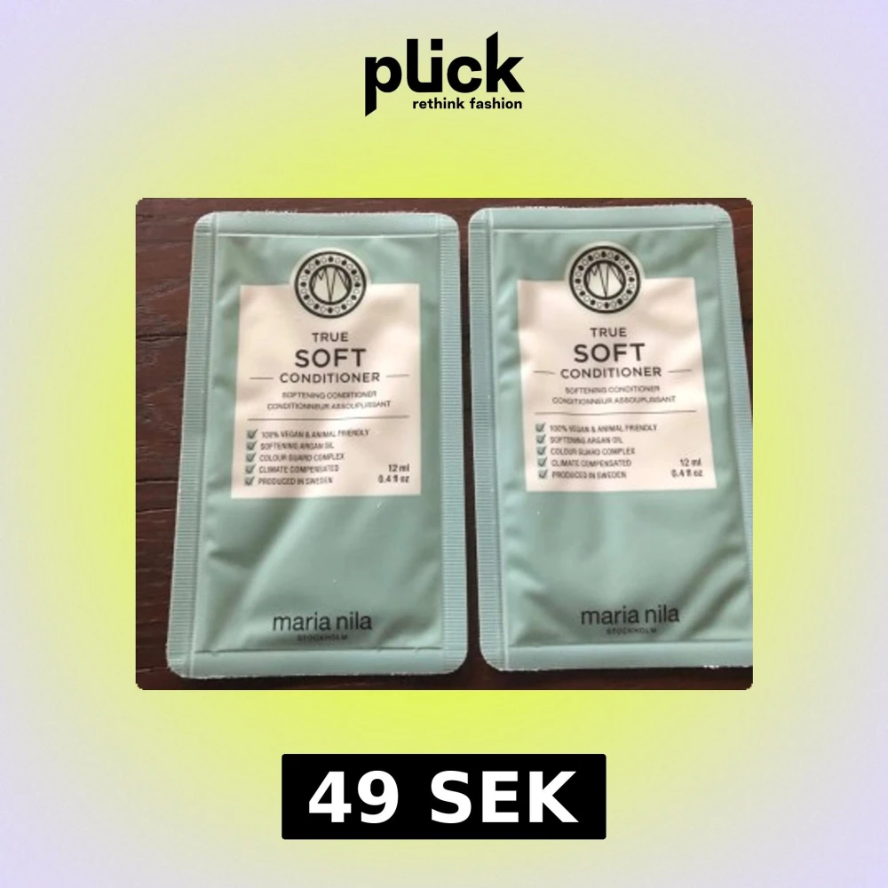 Två mintgröna engångsförpackningar med Maria Nila True Soft Conditioner, 12 ml vardera. Vegansk och djurvänlig formula med arganolja och Colour Guard Complex. Producerad i Sverige, perfekt för resan eller att testa produkten.