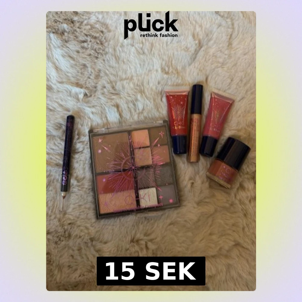 Säljer ett sminkset från Q-KI med en multifunktionell palett i sopiga nude- och bruna toner, två läppglans i rosa och röd sopig färg, ett guldigt läppglans, en ögonpenna och ett nagellack i nude. Perfekt för dig som gillar att experimentera med olika looks.