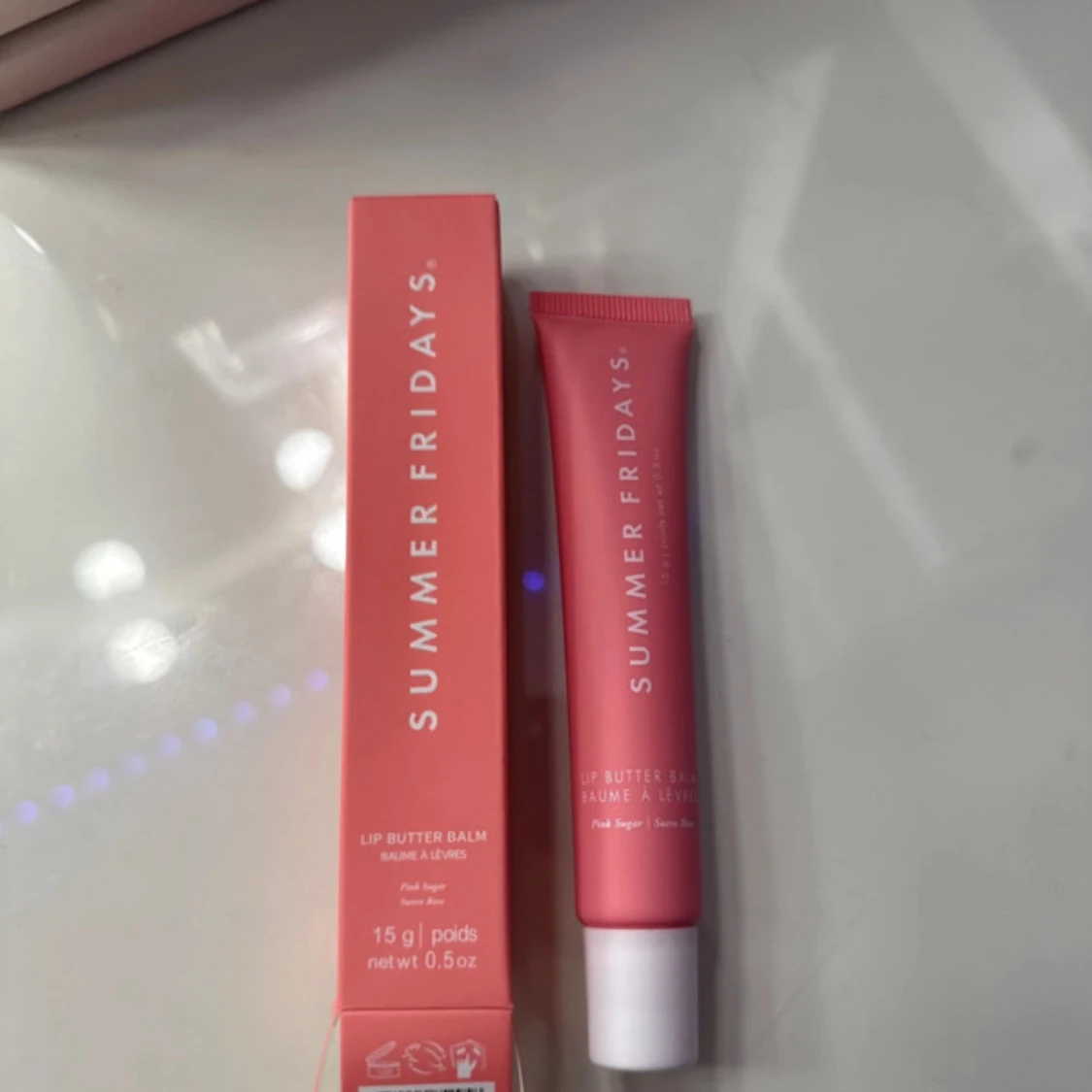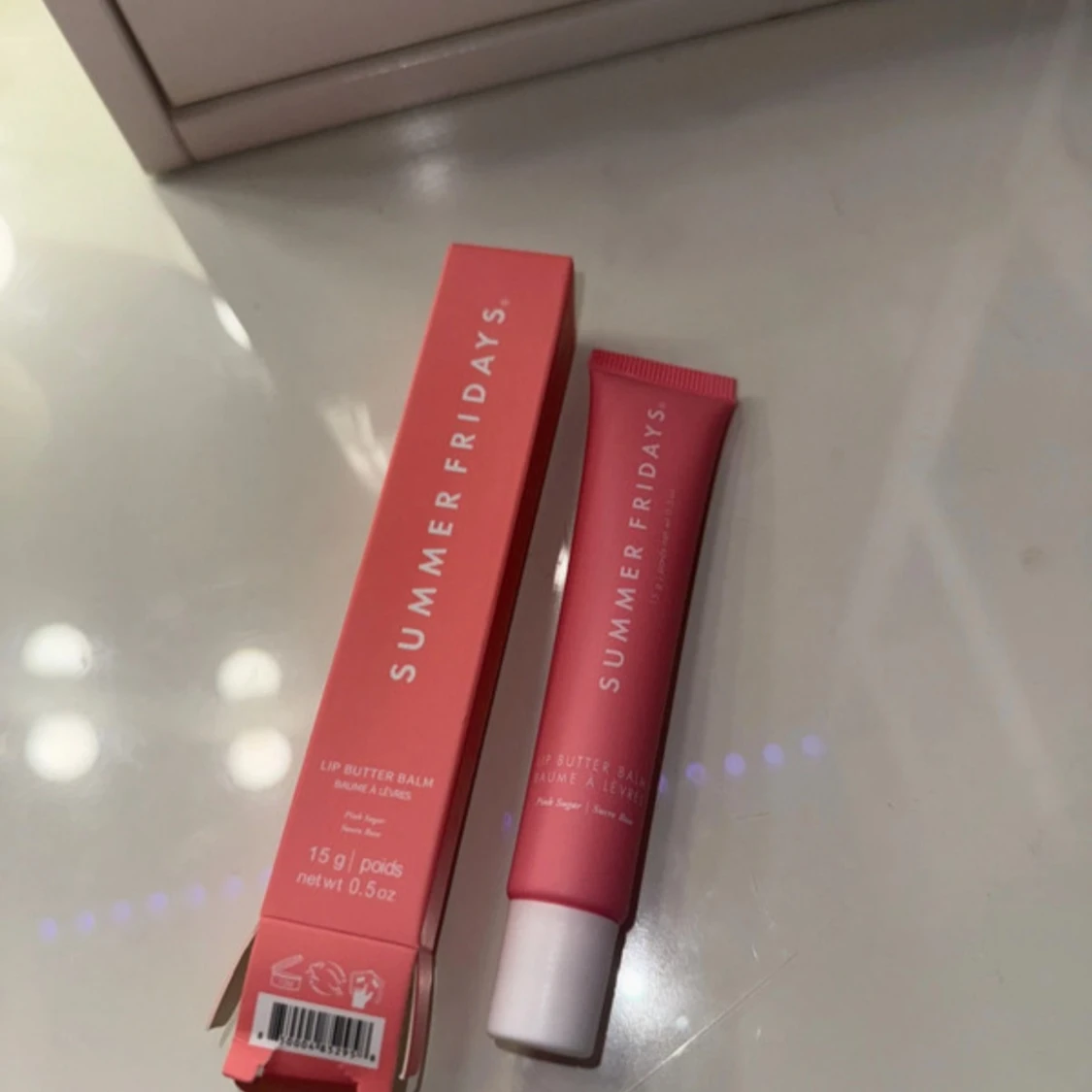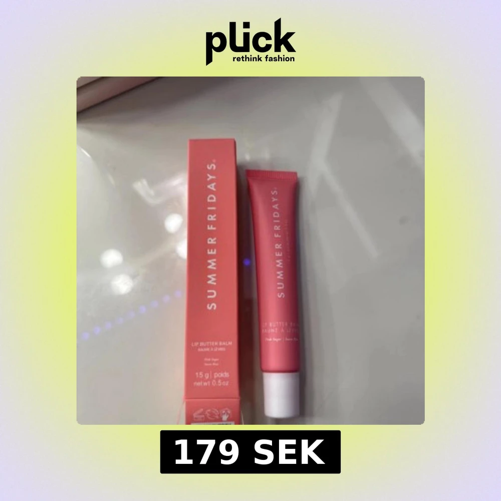 Lip Butter Balm från Summer Fridays i en rosa tub med vitt lock. Ger återfuktade och mjuka läppar med en lätt glans. Förpackningen innehåller 15 g och har en stilren design i rosa nyans. Färgen är Pink Sugar och helt helt oanvänd.
