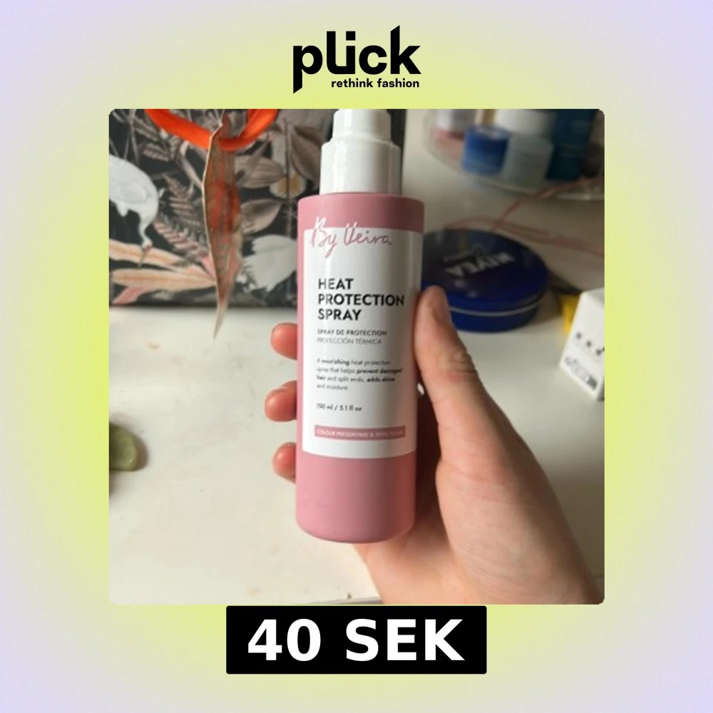 Säljer en rosa och vit flaska med By Veira Heat Protection Spray, 150 ml. Sprayen är vegansk och bevarar hårfärgen samtidigt som den skyddar mot värme och ger glans. Flaskan har en praktisk pump och är tillverkad av plast.
