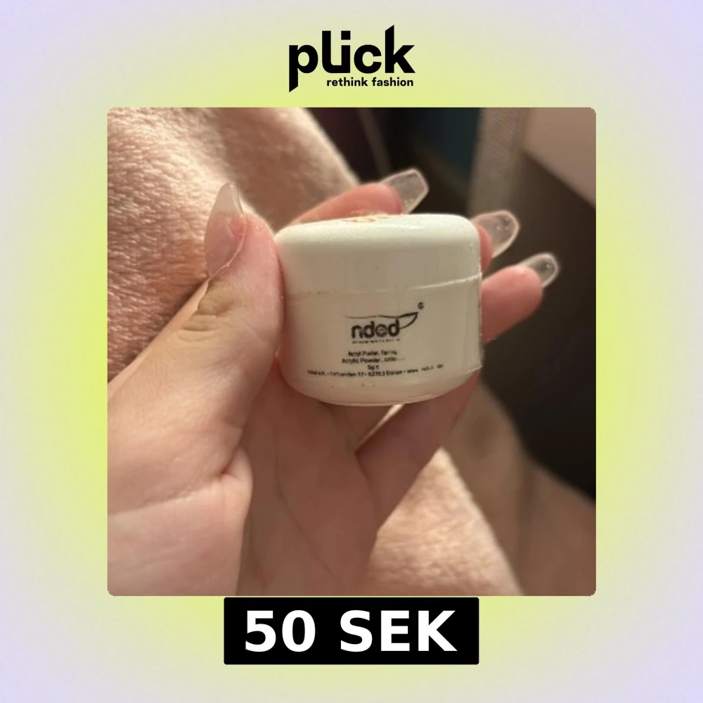 Litet vitt burk med akrylpulver från Nded, perfekt för nagelförlängning och design. Burken har varningssymboler och en hållbarhet på 12 månader efter öppning. Färgen är en rosa glittrig nästan helt full..