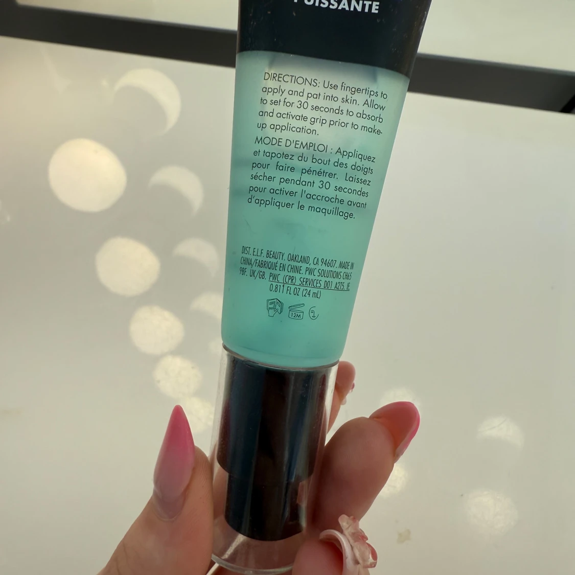 Säljer en e.l.f. Power Grip Primer i en snygg transparent tub med svart lock. Primern är ljusblå och kommer i en praktisk pumpflaska på 24 ml. Perfekt för att få sminket att sitta hela dagen och ge en jämn bas.