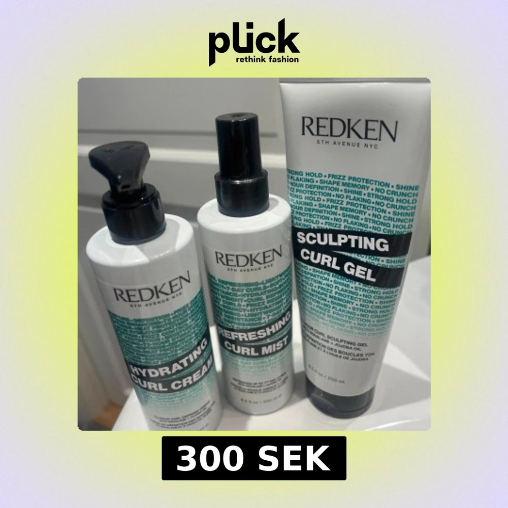 Säljer ett kit från Redken med Hydrating Curl Cream, Refreshing Curl Mist och Sculpting Curl Gel. Produkterna är i vita och svarta plastflaskor med turkos text och är perfekta för att definiera och återfukta lockigt hår. Innehåller jojobaolja och ger glans och stadga. Cirka 80 procent kvar i flaskorna.