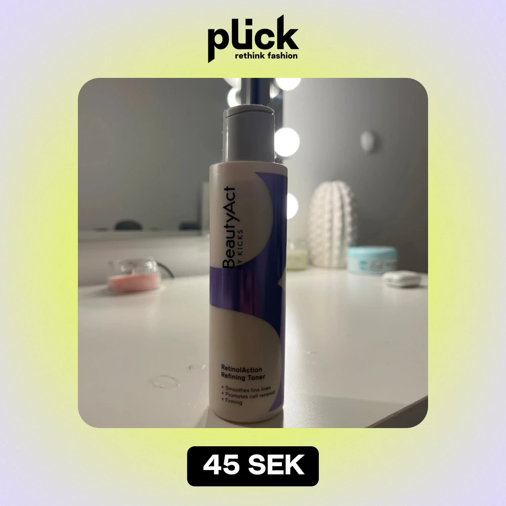 En toner från BeautyAct by Kicks som heter RetinolAction Refining Toner. Den kommer i en stilren flaska med lila och vita detaljer. Tonern är designad för att jämna ut fina linjer, främja cellförnyelse och ge en fastare hud.