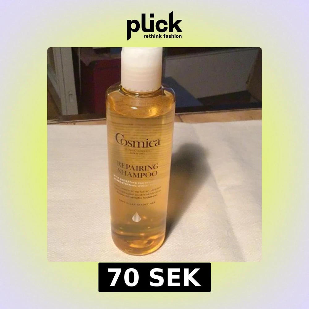 Cosmica Repairing Shampoo är en genomskinlig, gyllengul flytande schampo i plastflaska med vitt lock. Innehåller panthenol och vetextrakt som återfuktar och stärker håret. Passar för torrt eller skadat hår och är dermatologiskt testad samt vegansk.