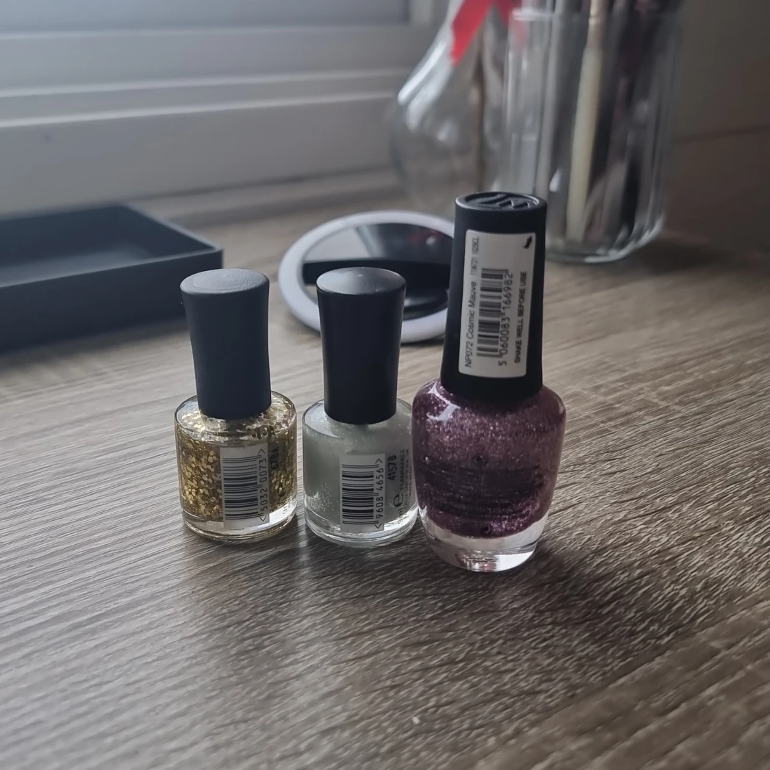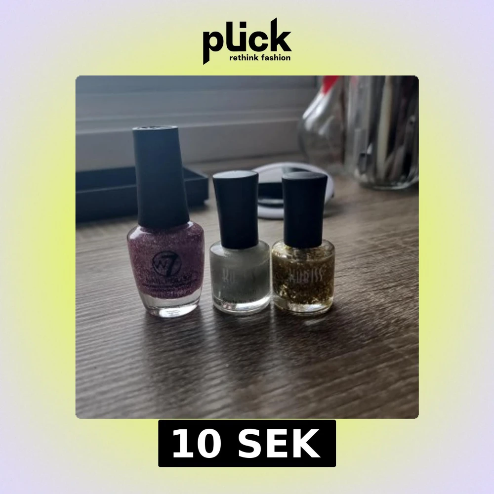 Säljer tre nagellack: ett lila glitterlack från W7, ett silvrigt och ett guldigt glitterlack från Kubiss. Alla har svarta korkar och klassisk rund glasflaska. Perfekt för dig som vill ha extra bling på naglarna.