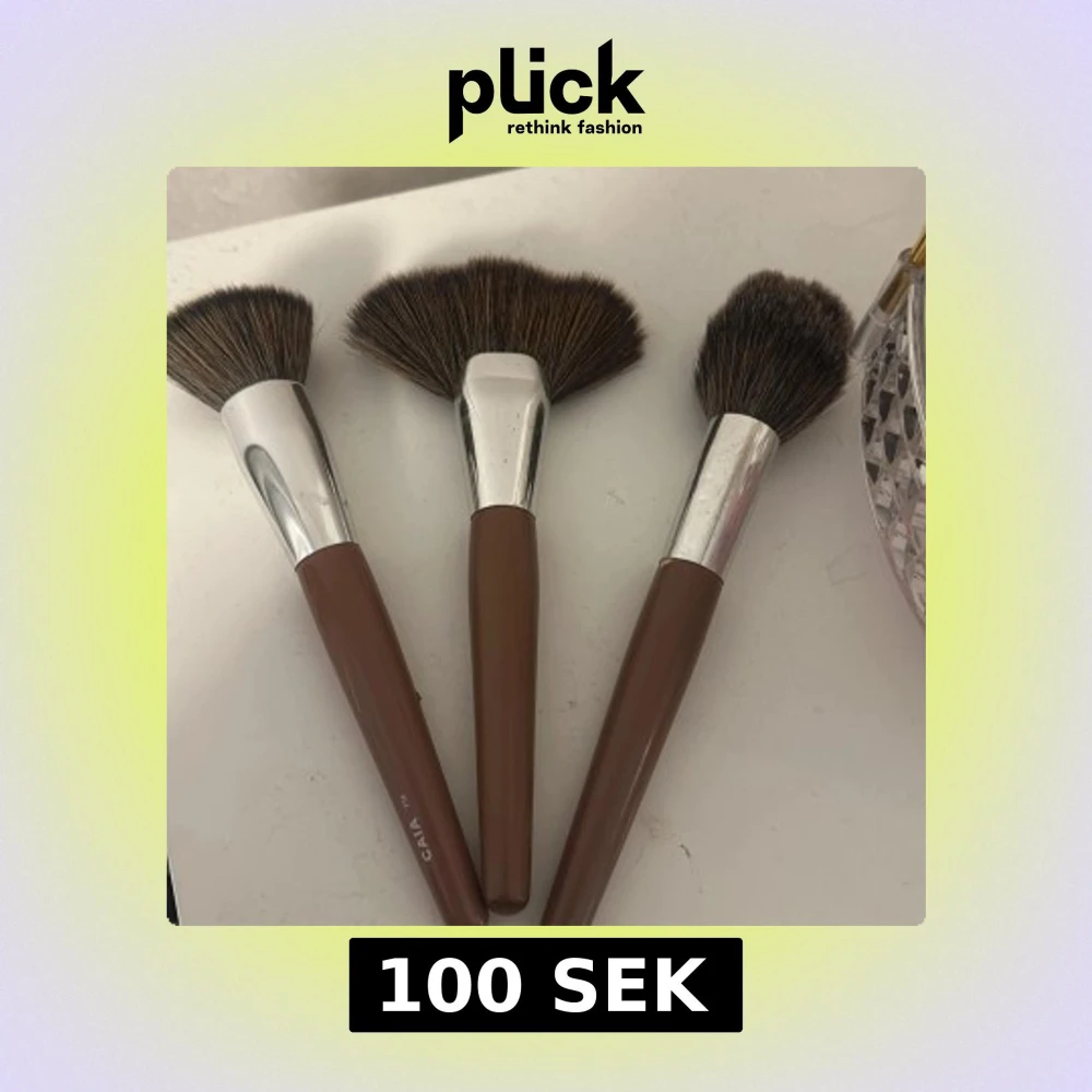 Säljer ett set med tre sminkborstar från CAIA med bruna handtag och silvriga detaljer. Borstarna har mjuka, täta borst i olika former: en rundad, en vinklad och en solfjäderformad, perfekta för foundation highlight och puder produkter!! En har en defekt se bild 2.