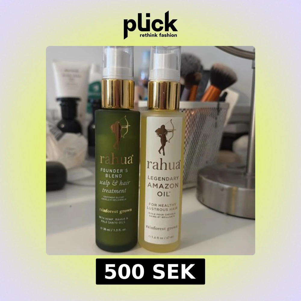 Två lyxiga hårprodukter från Rahua: en grön flaska med Founder’s Blend scalp & hair treatment och en ljusgul flaska med Legendary Amazon Oil.