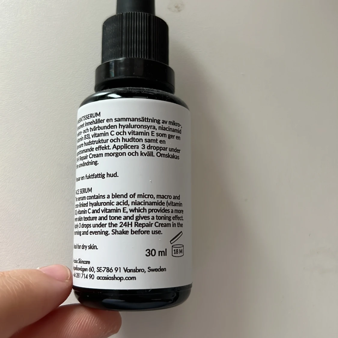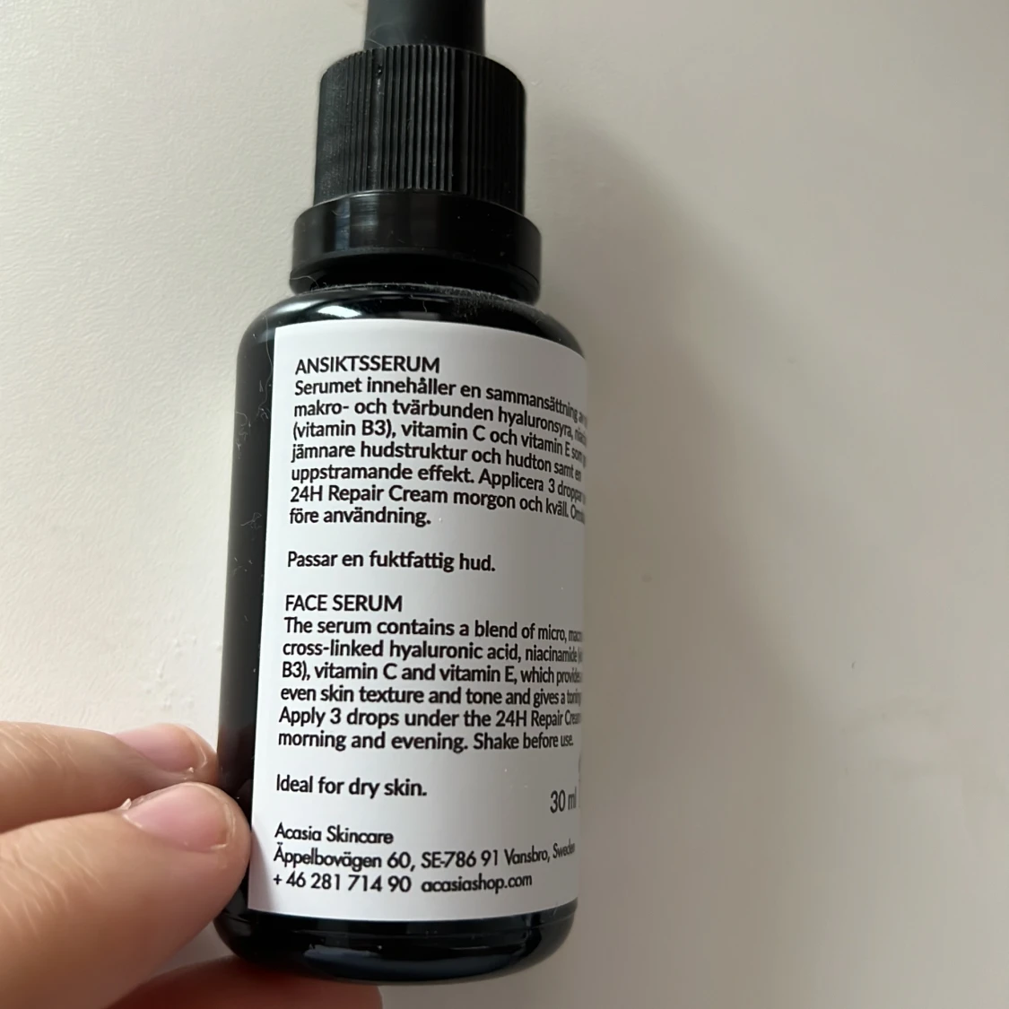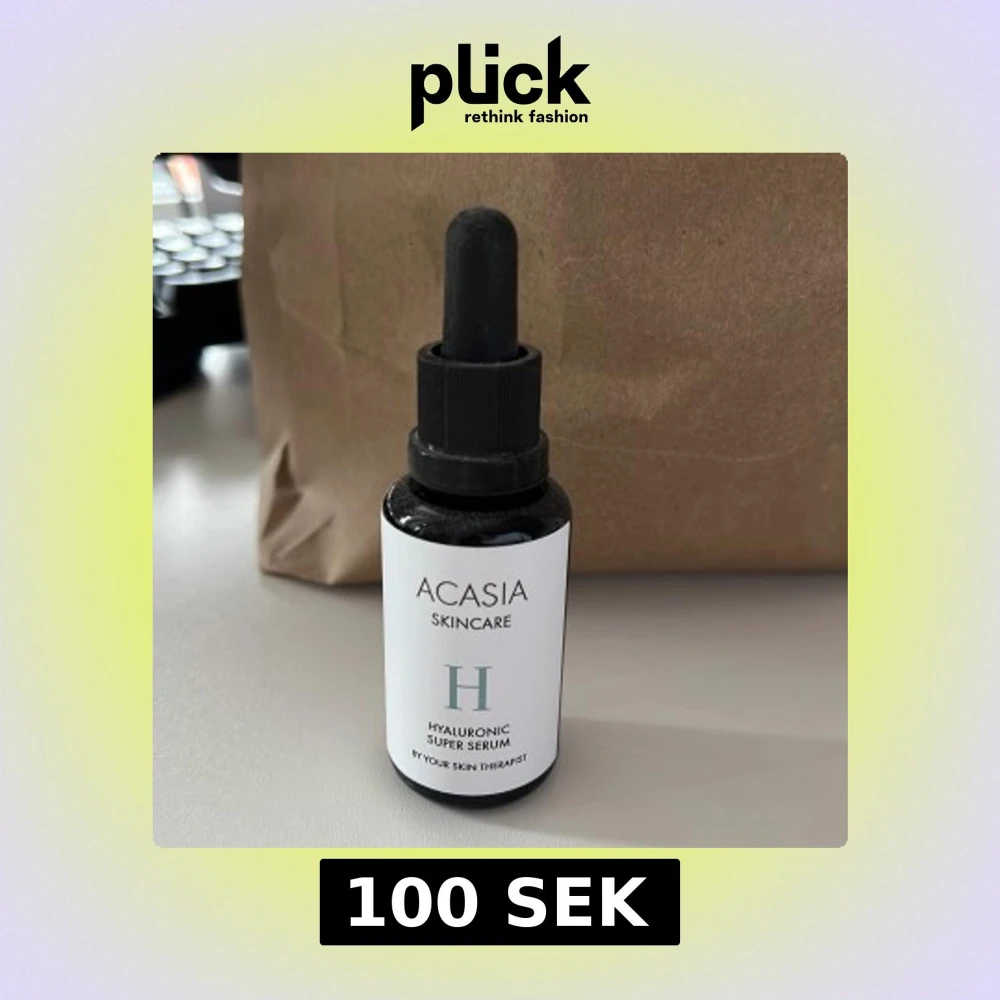 Acasia Hyaluronic Super Serum är ett ansiktsserum med hyaluronsyra, niacinamid, vitamin C och E. Kommer i en svart glasflaska med pipett och vit etikett. Perfekt för dig som vill ha extra fukt och glow i din hudvårdsrutin. Nypris 399kr. Helt oanvänd.