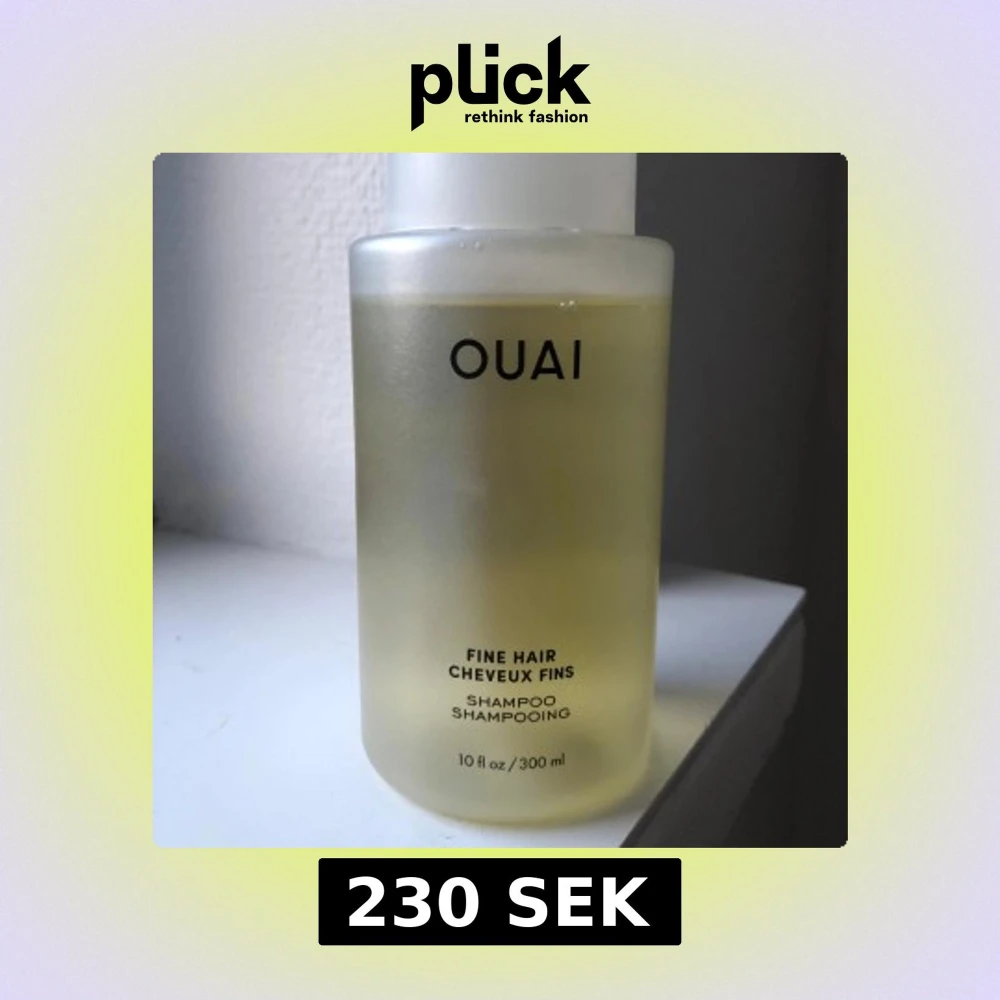 OUAI Fine Hair Shampoo i en frostad plastflaska på 300 ml. Schampot är ljusgult och passar för tunt hår. Innehåller stärkande keratin, biotin och chiafröolja för att ge volym och styrka. Snygg minimalistisk design med svart text på flaskan.