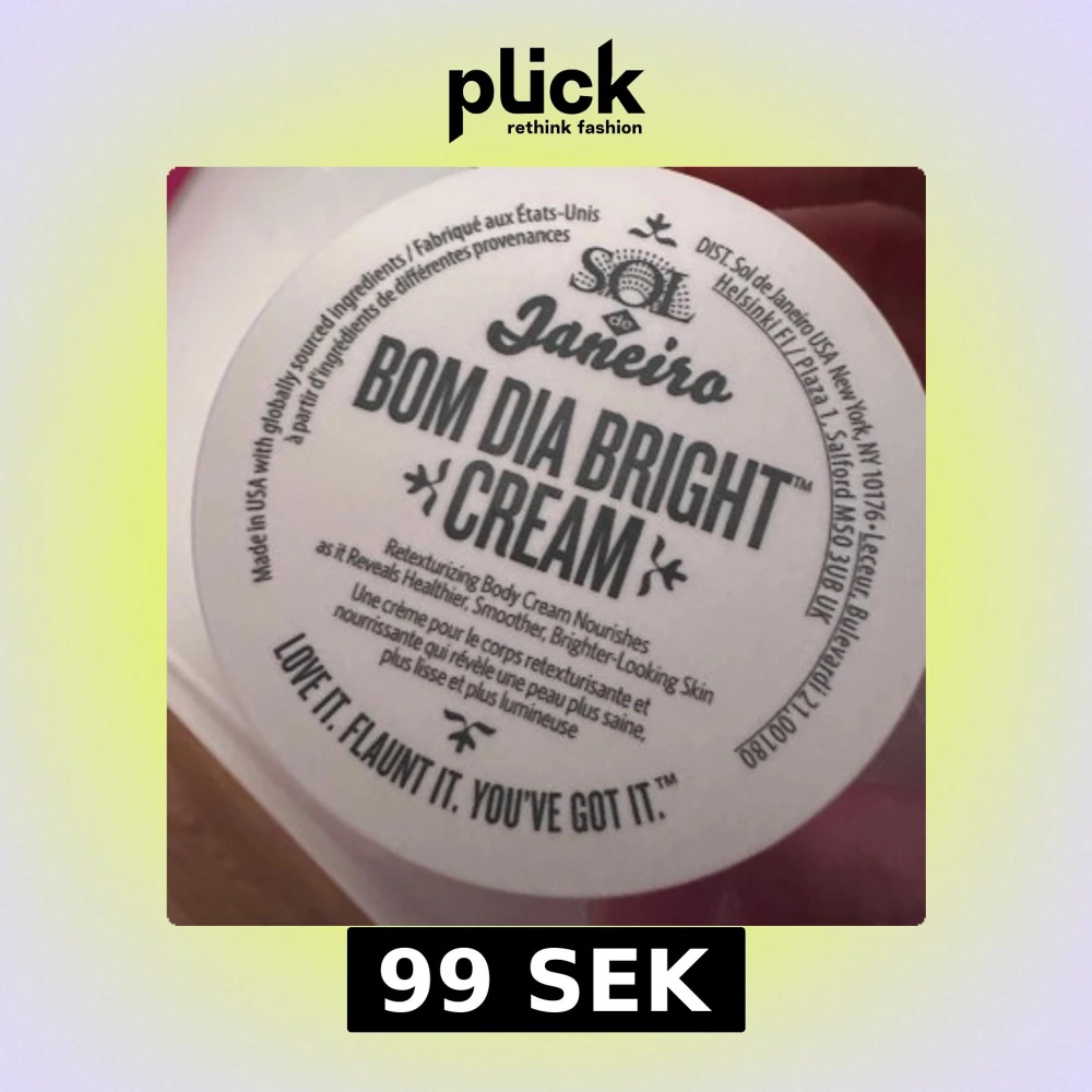 Sol de Janeiro Bom Dia Bright Cream är en återfuktande kroppskräm som innehåller fruktsyror och vitamin C för att ge huden en jämnare och ljusare ton. Den kommer i en rund, röd burk med vit text. Gillar ej doften änvänd en gång