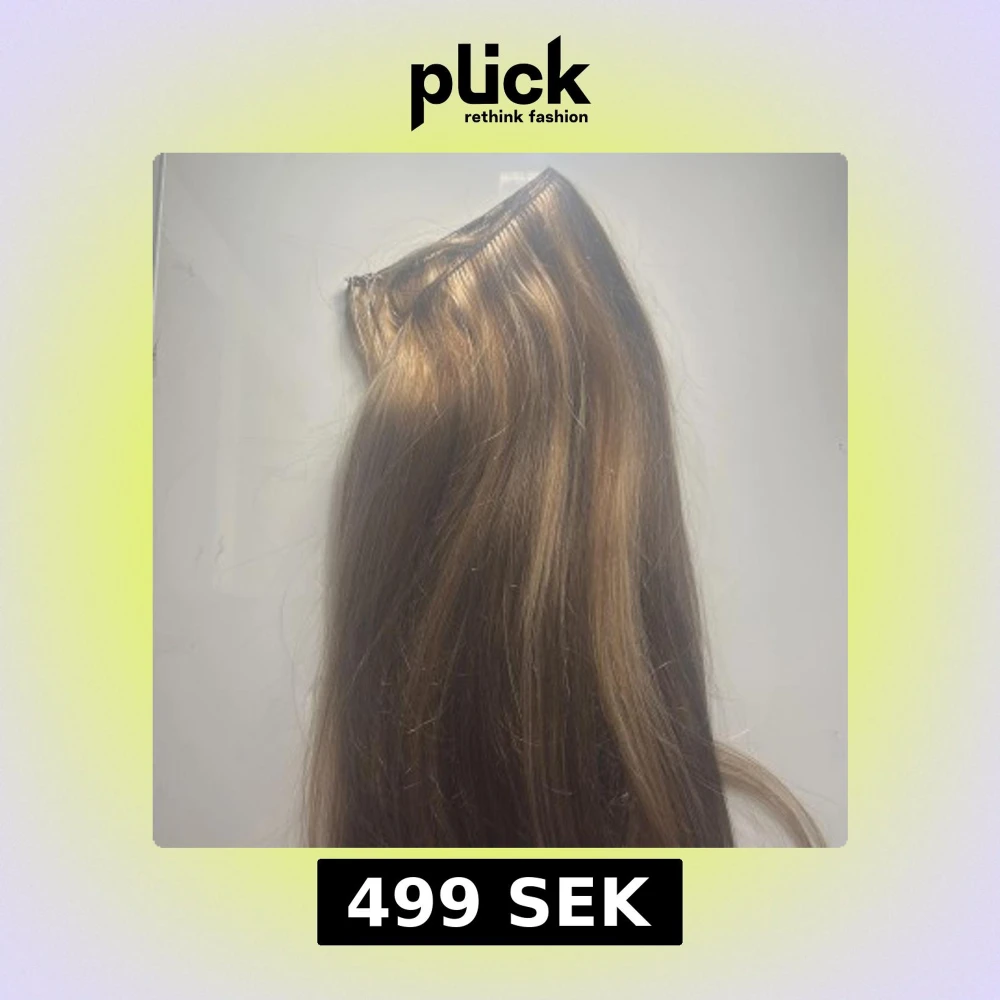 Säljer ett set med långt löshår i mixade bruna och blonda nyanser. Håret är rakt och har en naturlig glans. Fästet är en tunn weft med tråd för enkel applicering.