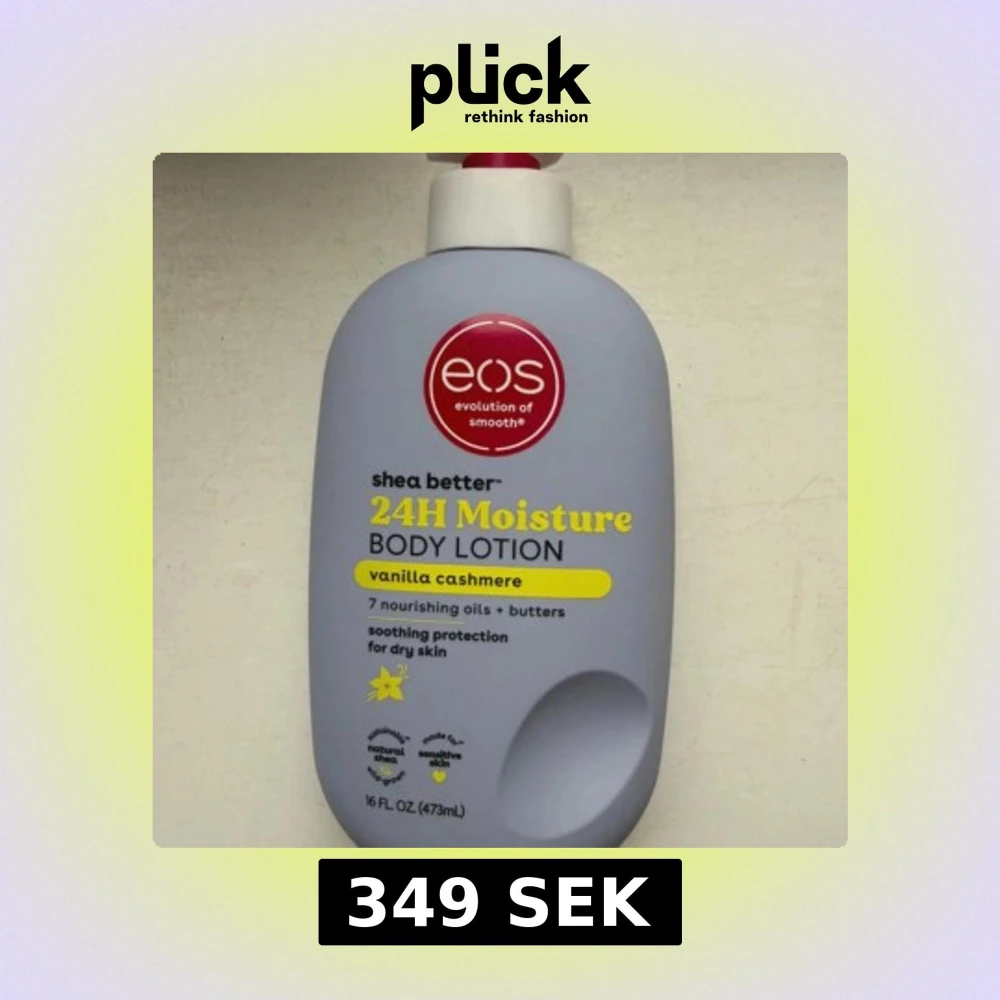 EOS shea better 24H Moisture Body Lotion i doften vanilla cashmere. Innehåller 7 närande oljor och smör, med sheasmör och sheaolja för silkeslen hud. Ljuslila plastflaska med pump, 473 ml. Vegansk, parfym med vanilj, mysk och karamell. Säljs inte i Sverige, köpt i USA! HELT OANVÄND! Pris går ju såklart att diskutera.