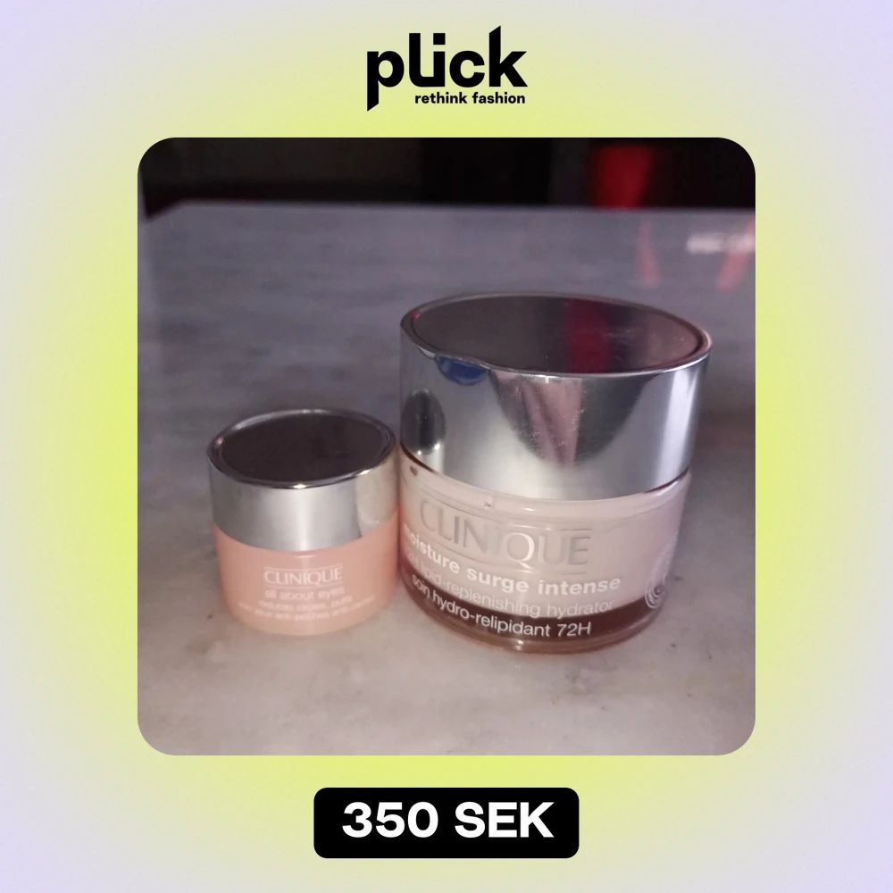 Säljer två återfuktande krämer från Clinique. Den större burken är Moisture Surge Intense 72H, perfekt för torr hud. Den mindre burken är en ögonkräm, också från Clinique, som ger extra fukt och fräschör. Båda har en lyxig känsla med silverlock och är idealiska för daglig användning.