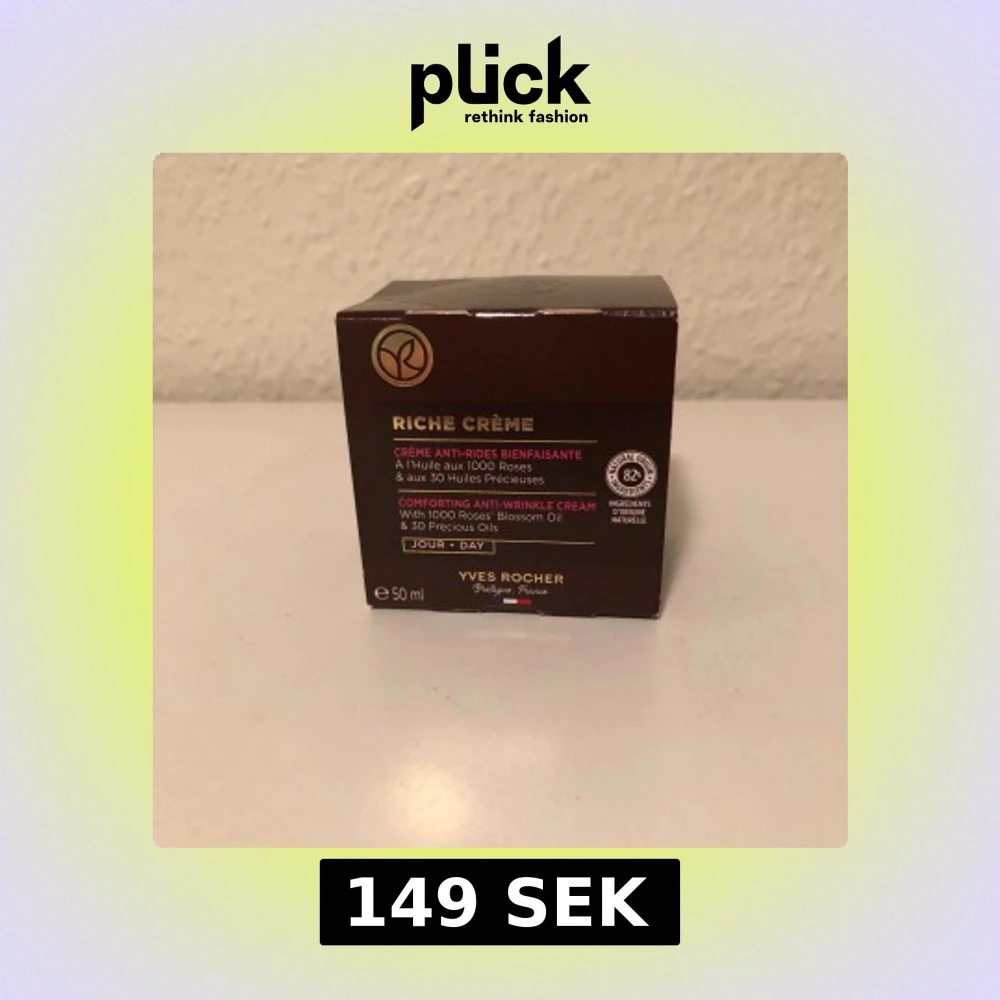 Riche Crème dagkräm från Yves Rocher med 1000 rosors blomolja och 30 värdefulla oljor. Denna anti-rynkkräm är designad för att ge komfort och näring till huden. Förpackningen innehåller 50 ml och är märkt med 82% naturliga ingredienser.