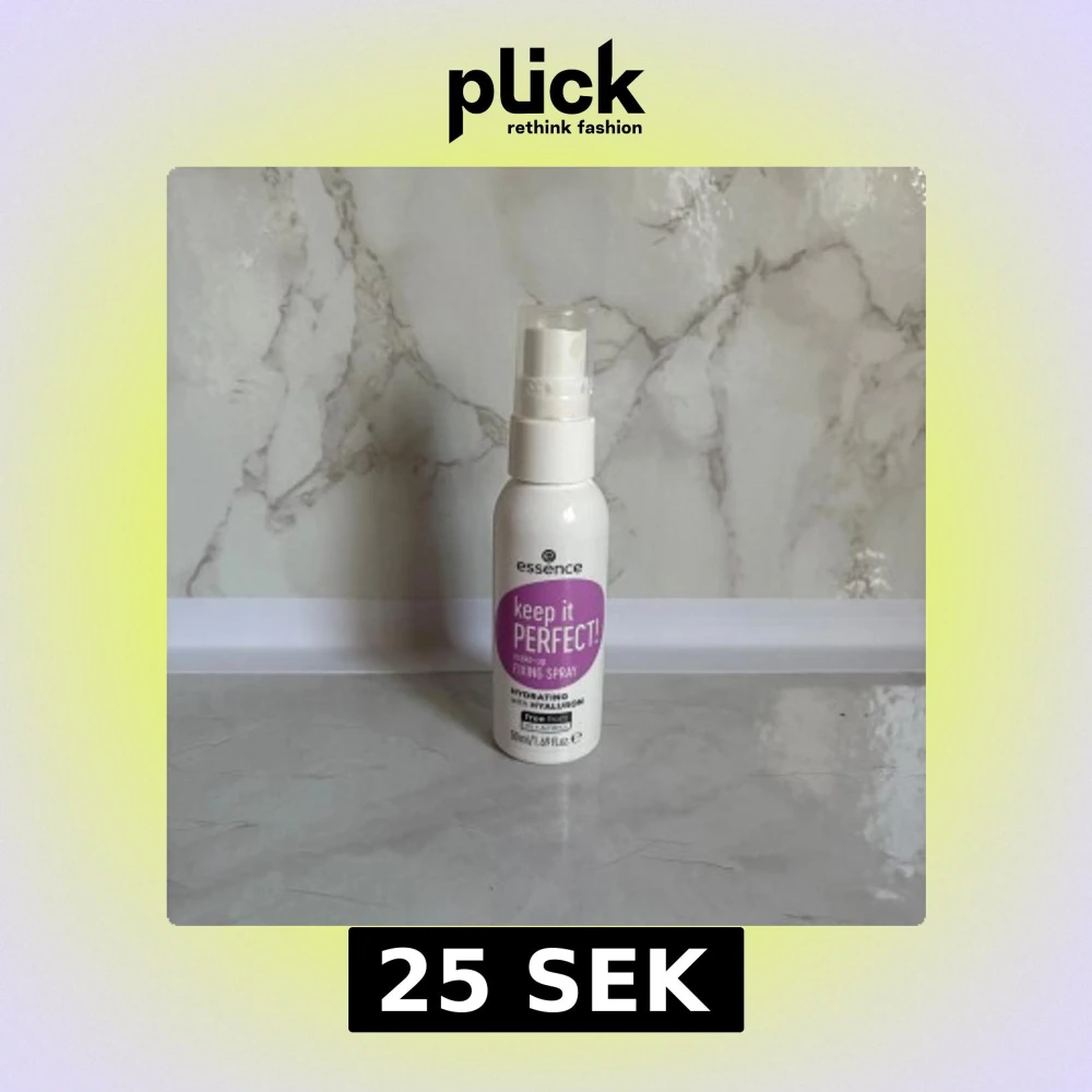 Essence Keep It Perfect! make-up fixing spray i en vit plastflaska med spraymunstycke. Innehåller 50 ml och är återfuktande med hyaluron. Perfekt för att fixera sminket och ge en fräsch finish. Fri från olja och alkohol.