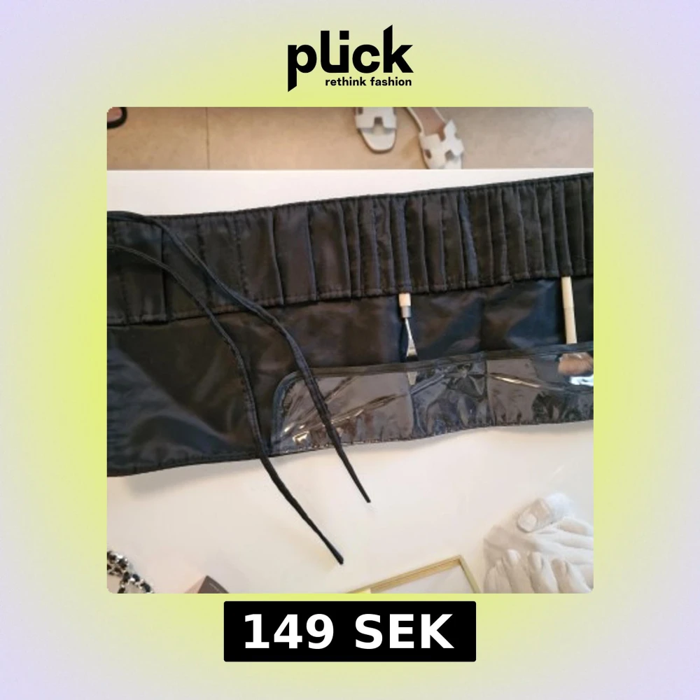 Svart sminkbälte med flera fack för penslar och tillbehör. Bältet har snörning för att knytas runt midjan och transparent plastficka för enkel översikt. Tillverkat i syntetmaterial med slät yta och stilren design, perfekt för dig som gillar att hålla ordning på sminket.