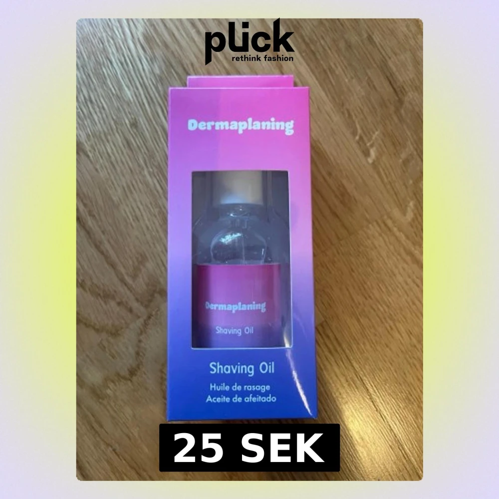 Transparent rakolja för ansiktet i en liten flaska med vit kork, för att underlätta dermaplaning och ge en smidig rakning. Förpackningen är rosa och lila med instruktioner på flera språk. Oljan hjälper rakbladet att glida lätt över huden.