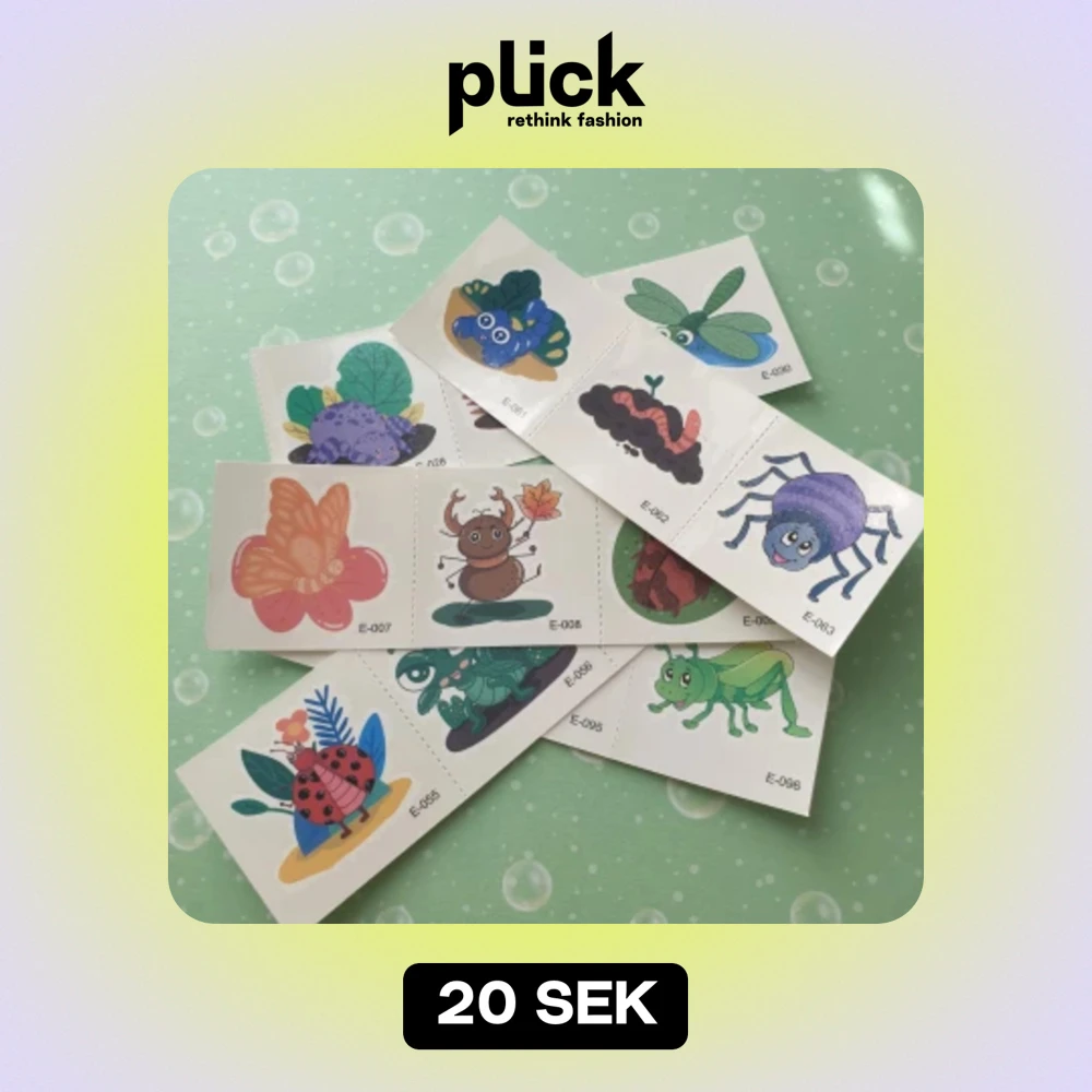 Tatuering/tattoo Motiv: insekter Antal: 5st ark Storlek: ca 4×12cm Skick: nya/oanvända Tillfälliga tatueringar du sätter på kroppen med hjälp av vatten
