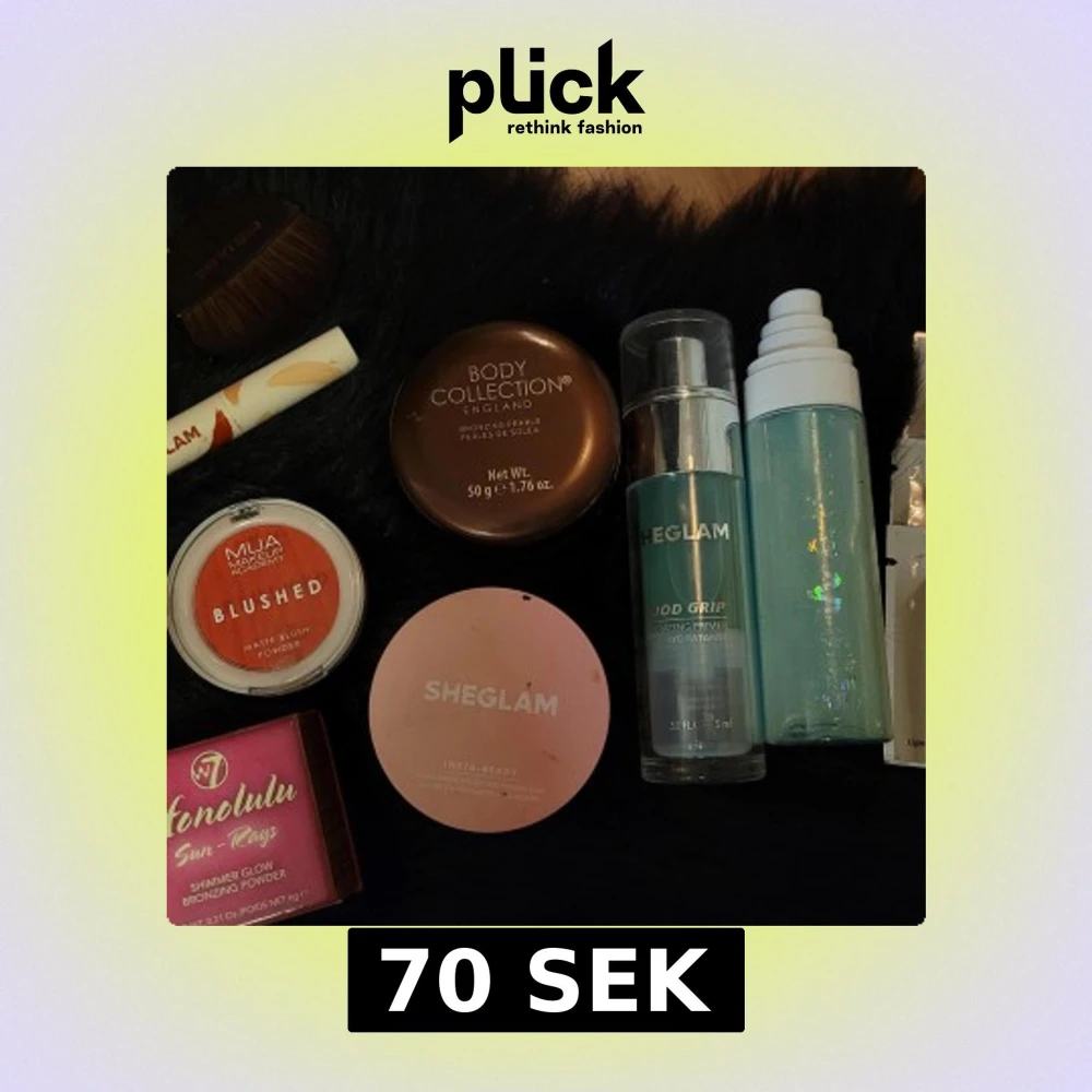 Ett sminkpaket med SHEGLAM Insta-Ready puder, SHEGLAM Good Grip primer, Body Collection bronzing pearls i bronsfärg, MUA Blushed matt rouge i korall, W7 Honolulu Sun-Rays shimmer glow bronzer, sminkborste och en blå face mist. Perfekt för dig som gillar glow och fräscha baser.