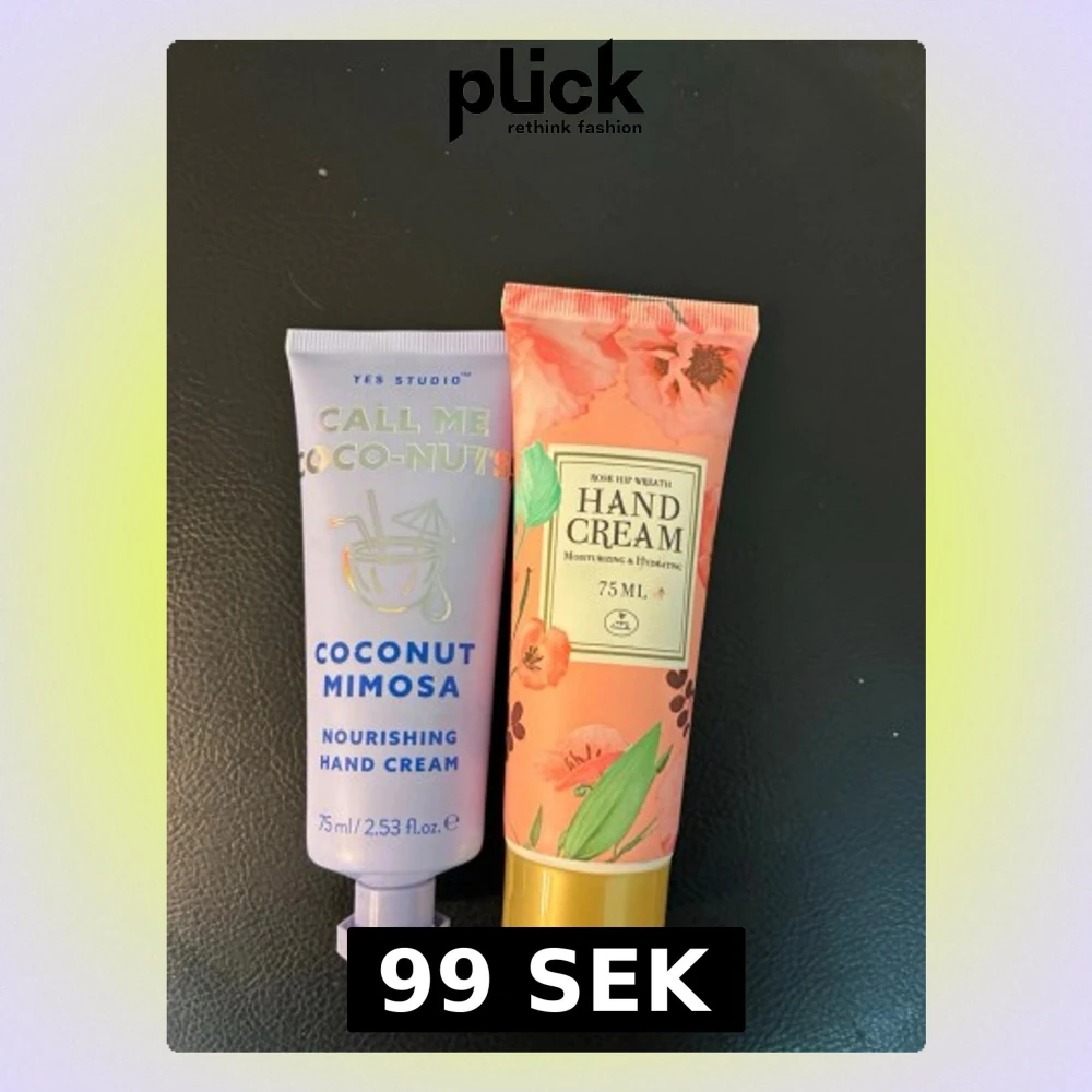 Två handkrämer, en från Yes Studio med doft av coconut mimosa i lila tub och en med rosdesign och gul kork med doft av rose hip. Båda är återfuktande och kommer i snygga tuber på 75 ml. Kommer ej till användning. Ej använd. 69 kr styck eller 99kr för båda.