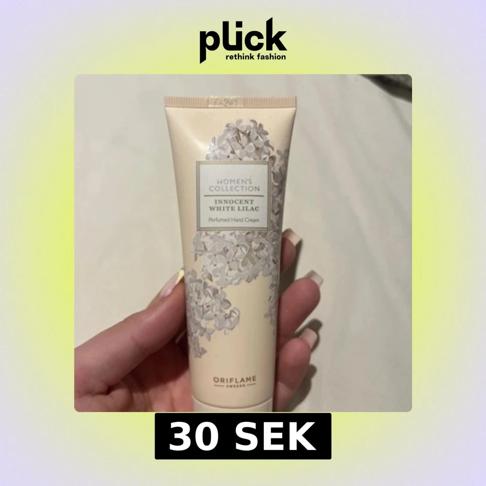 En parfymdoftande handkräm från Oriflame, Women's Collection Innocent White Lilac. Tuben är ljusbeige med blommigt mönster i vitt och grått. Innehåller 75 ml och har en söt, blommig doft av vit syren. Perfekt att ha i väskan för mjuka händer.