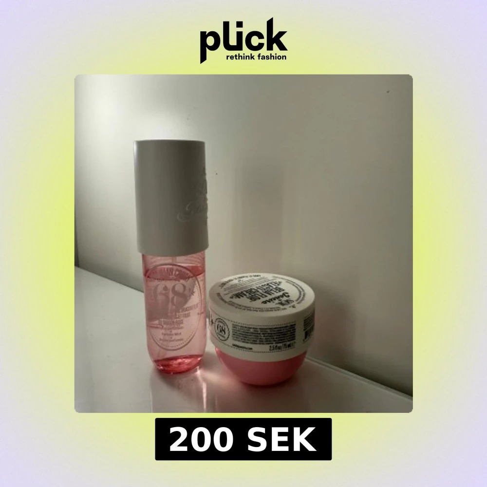 Säljer en rosa face mist och en matchande kräm från Sol de Janeiro. Face misten har en fräsch doft och kommer i en genomskinlig flaska med vit kork. Krämen är i en rund rosa burk med vit etikett. Se bilder för mängd